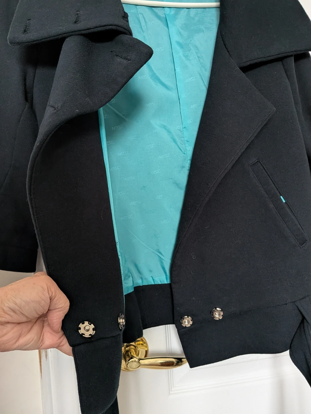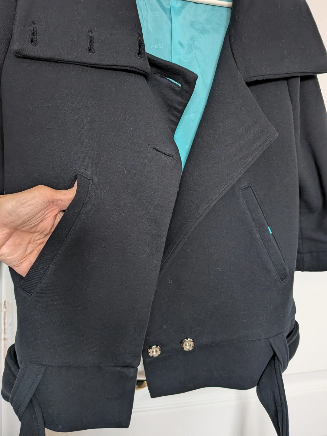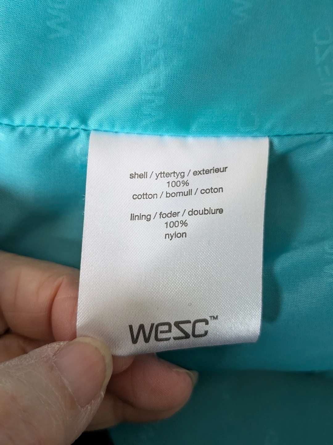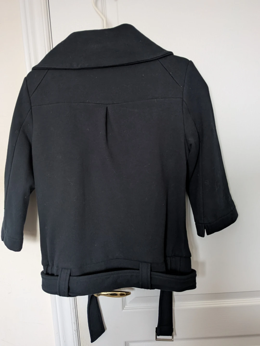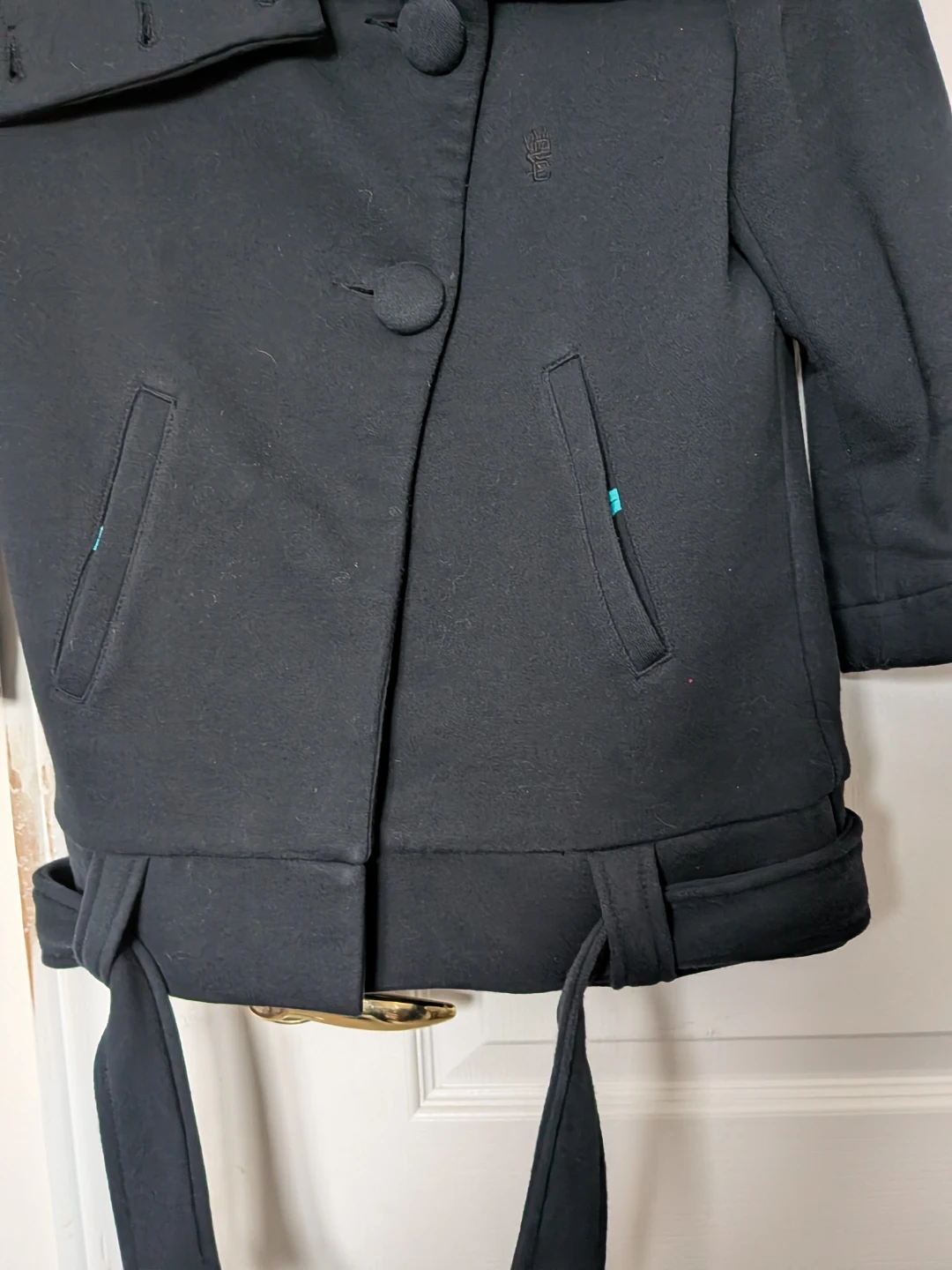 Here's a stylish WESC jacket in black! It's a size medium and features a unique design with a wide collar and belted waist. The jacket has a nice, structured look and is in great condition. Perfect for adding a touch of cool to your wardrobe!
