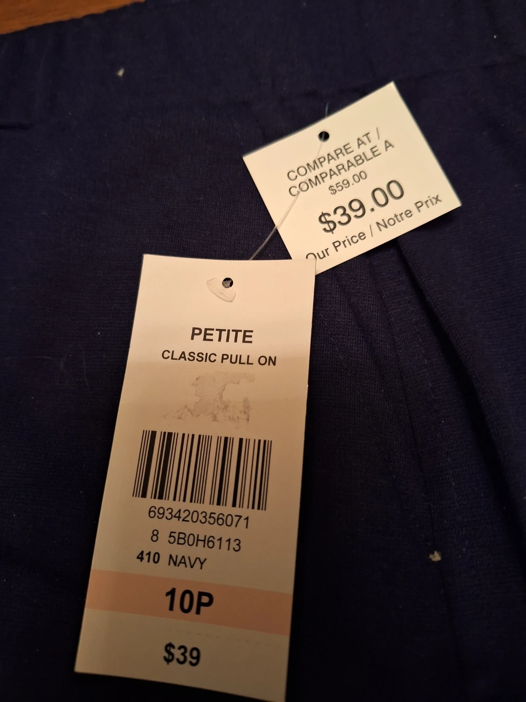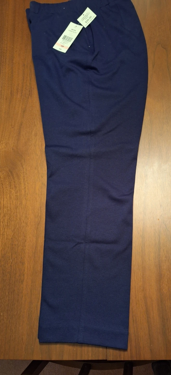 New with Tags Ladies Navy Classic Pull On Pants - size 10 petite. Pants are 75% Polyester, 19% Cotton, 6% Spandex. The original price tag is $39.