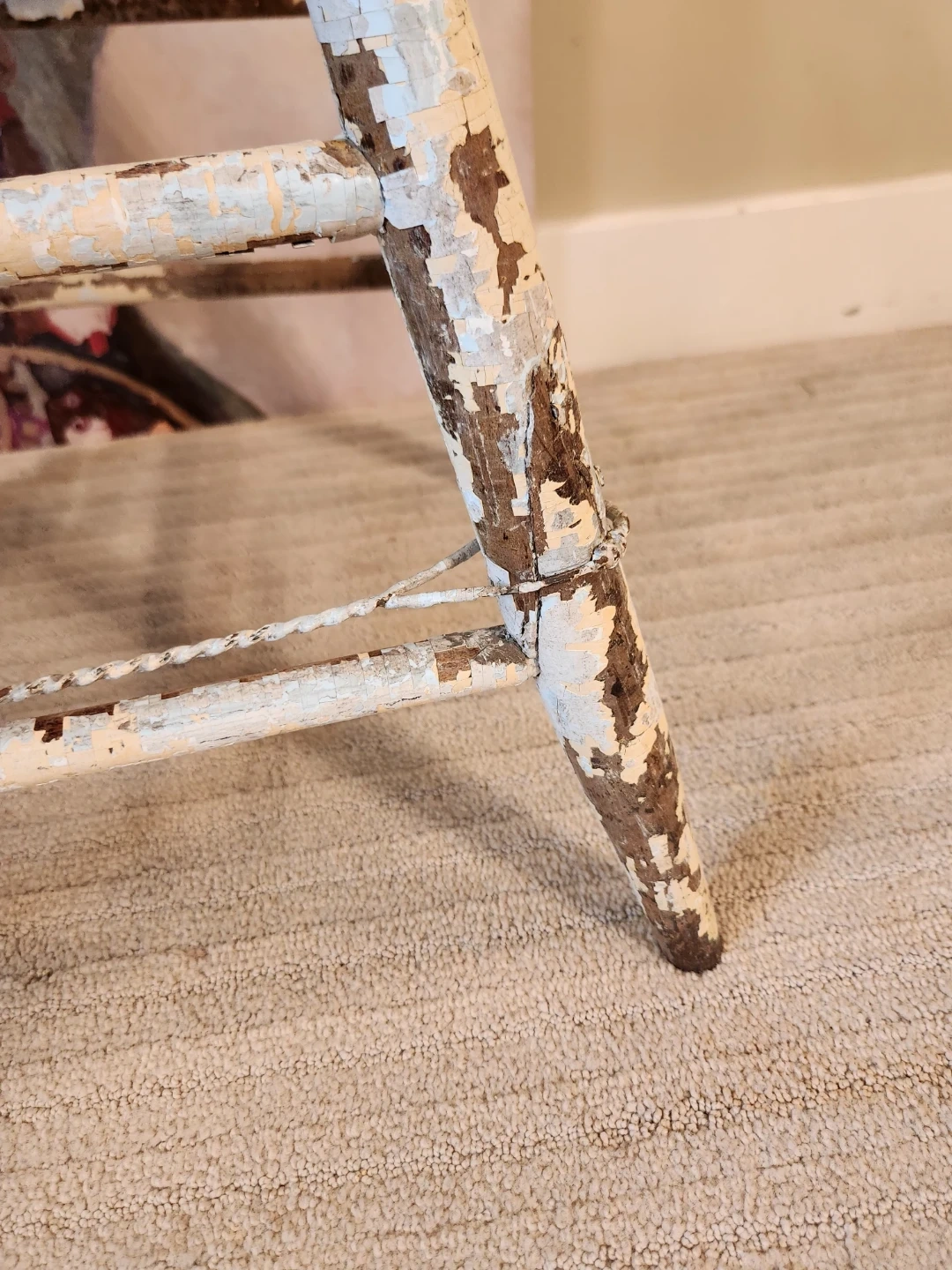 This antique treasure tells a hundred stories of people, family and love. This piece has baucoup character and rustic cottagecore and farmhouse charm. Use it as a plant stand, photography shoots or spare seating, it's sturdy and stylish! Seat surface is 15x15 and 17 inches high. Top of chair back is 32 inches high.