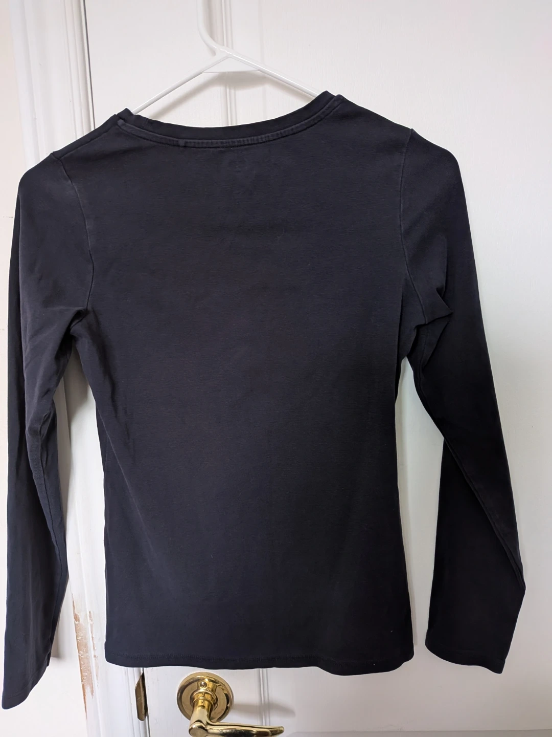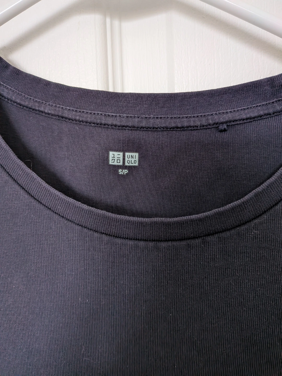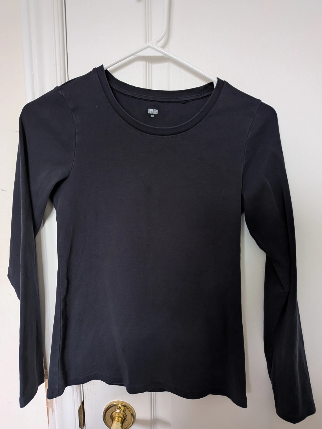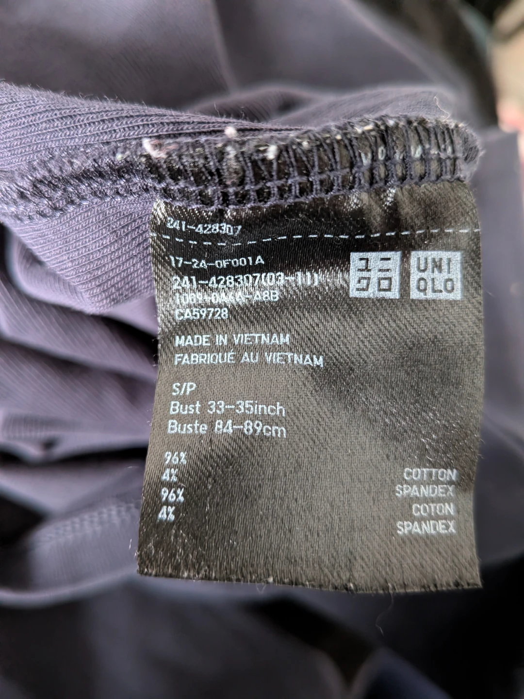 Selling a Uniqlo long sleeve top in size small. It's a dark colour, almost black! The material is 96% cotton and 4% spandex. Bust measures 33-35 inches or 84-89 cm
