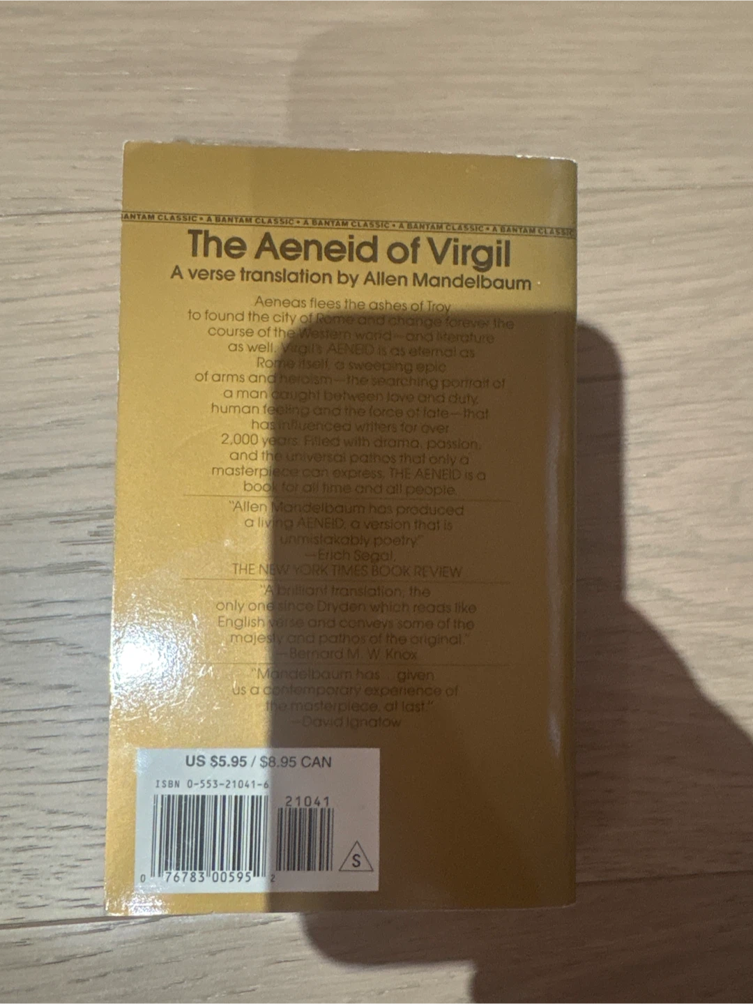 Selling a copy of The Aeneid of Virgil, translated by Allen Mandelbaum. This Bantam Classic is a great addition to any bookshelf! Originally priced at US $5.95 / $8.95. One page has a small bend as shown in last photo.