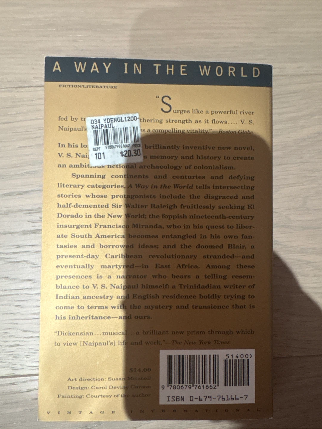 Selling a copy of "A Way in the World" by V.S. Naipaul. There is a bend on one of the pages as shown in the last photo.