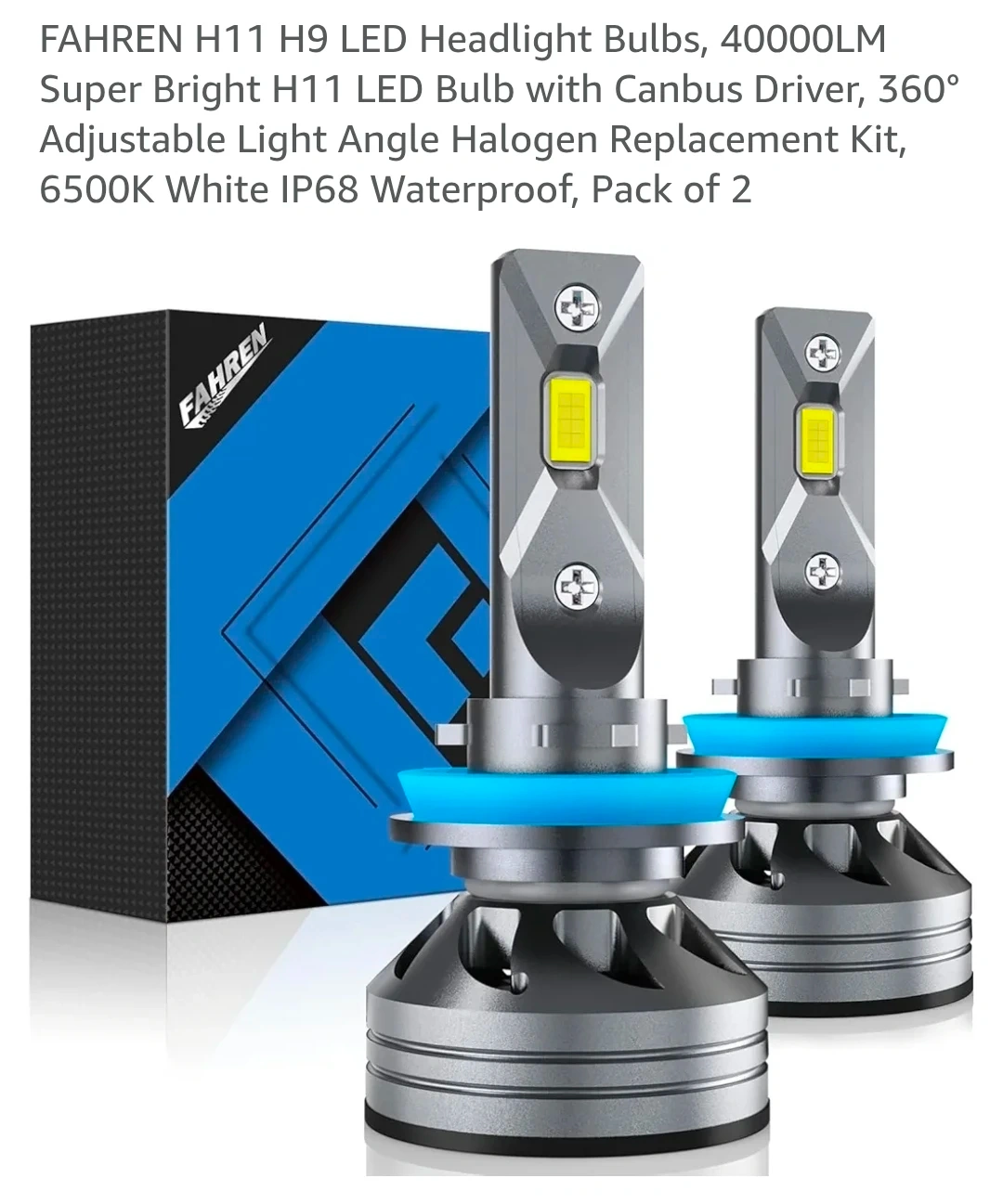 I'm selling a new pair of Fahren H11/H9 LED headlight bulbs. They're super bright with 40000LM and have a Canbus driver. These bulbs offer a 360° adjustable light angle and are IP68 waterproof! The kit includes two 6500K white halogen replacement bulbs.