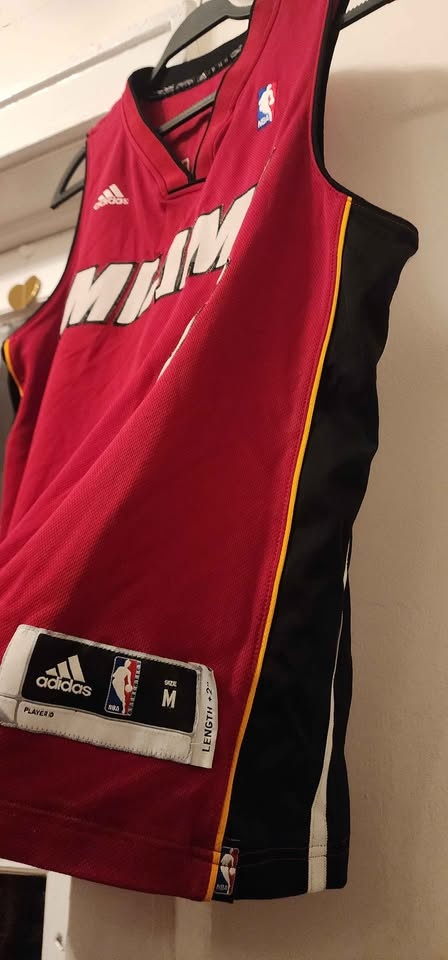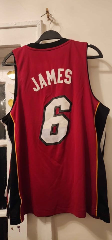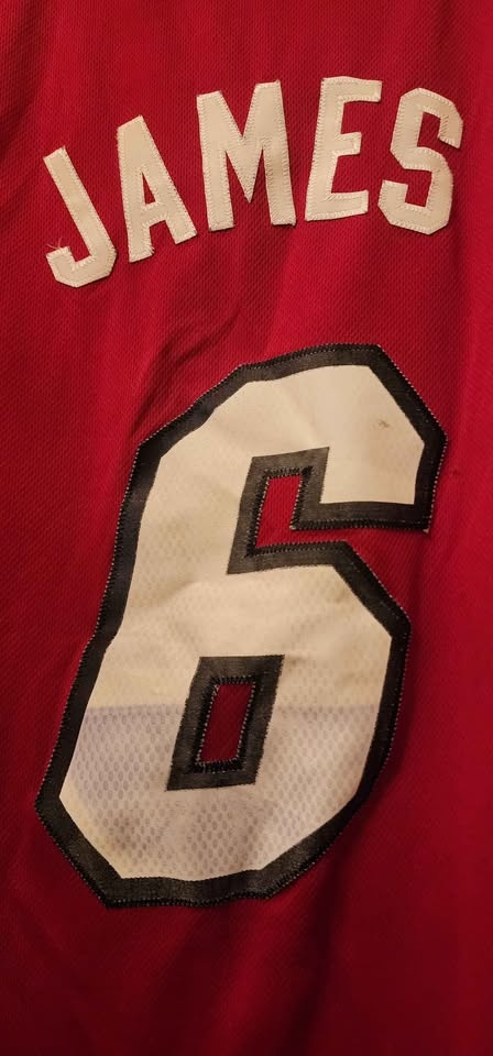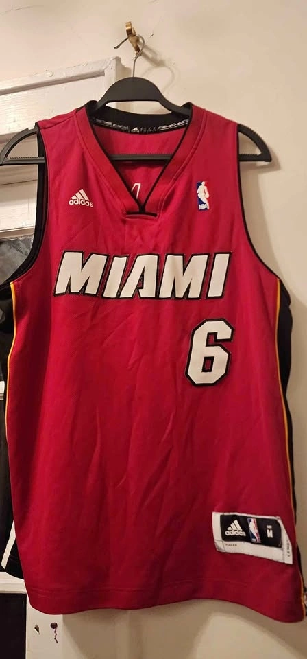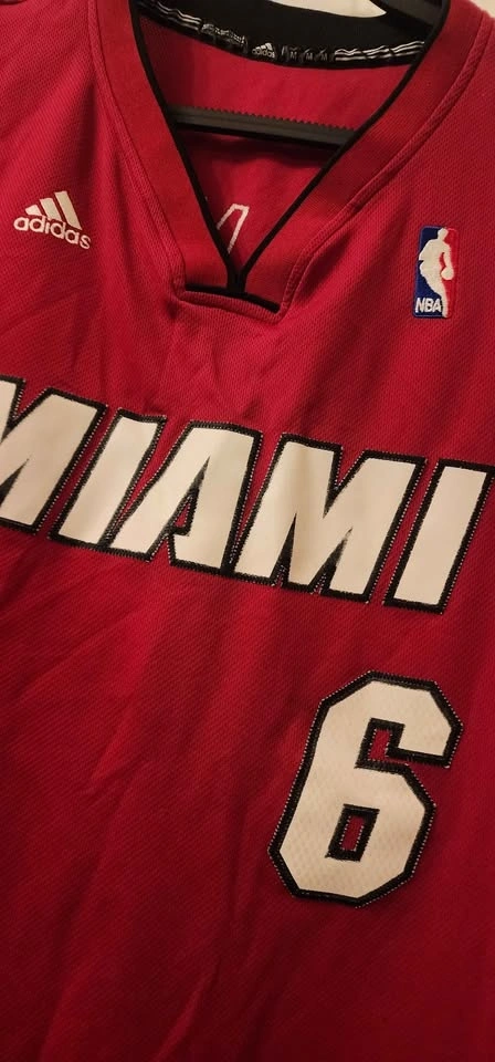 Adidas Miami Heat LeBron James #6 red swingman Jersey. This style of Jersey was used during James' four-season tenure with the Heat from 2010 to 2014