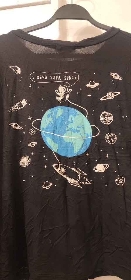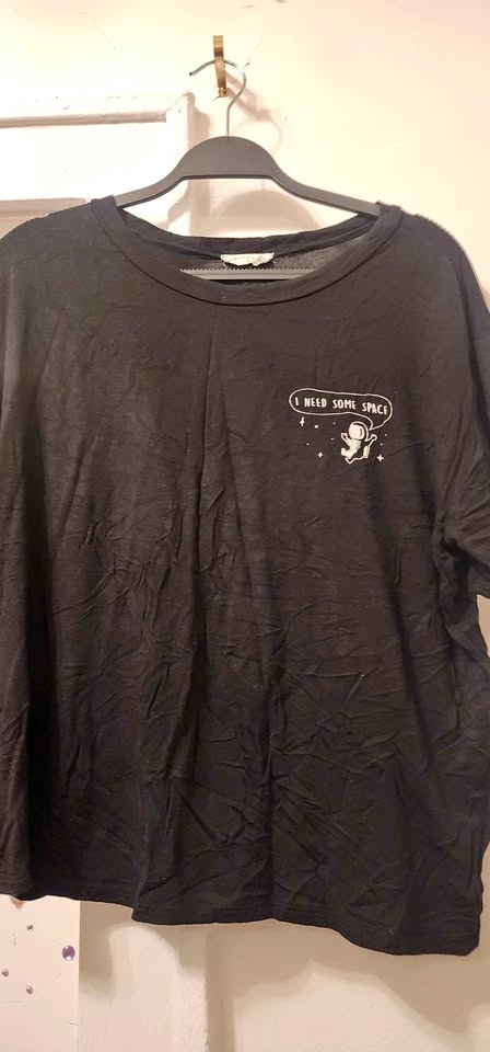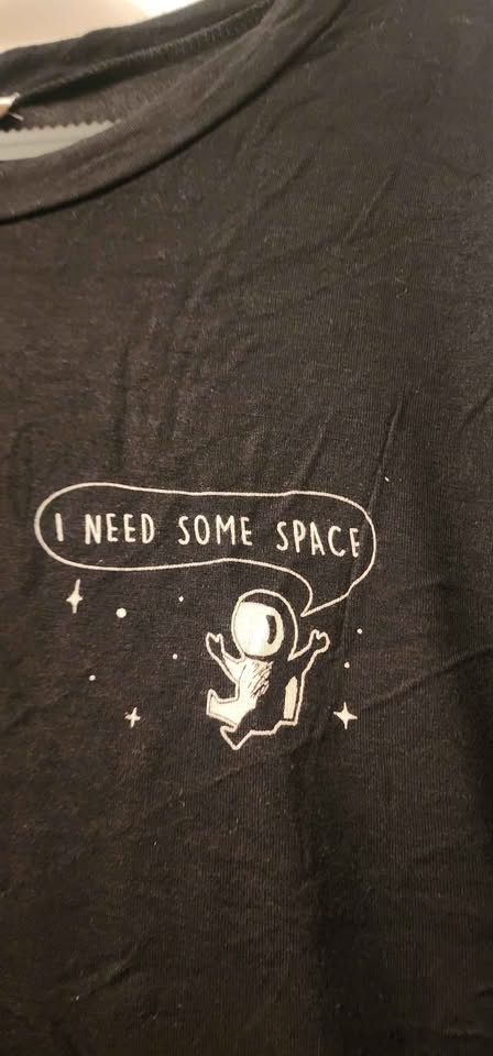 Black graphic t-shirt with a small astronaut print on the chest that says "I NEED SOME SPACE".