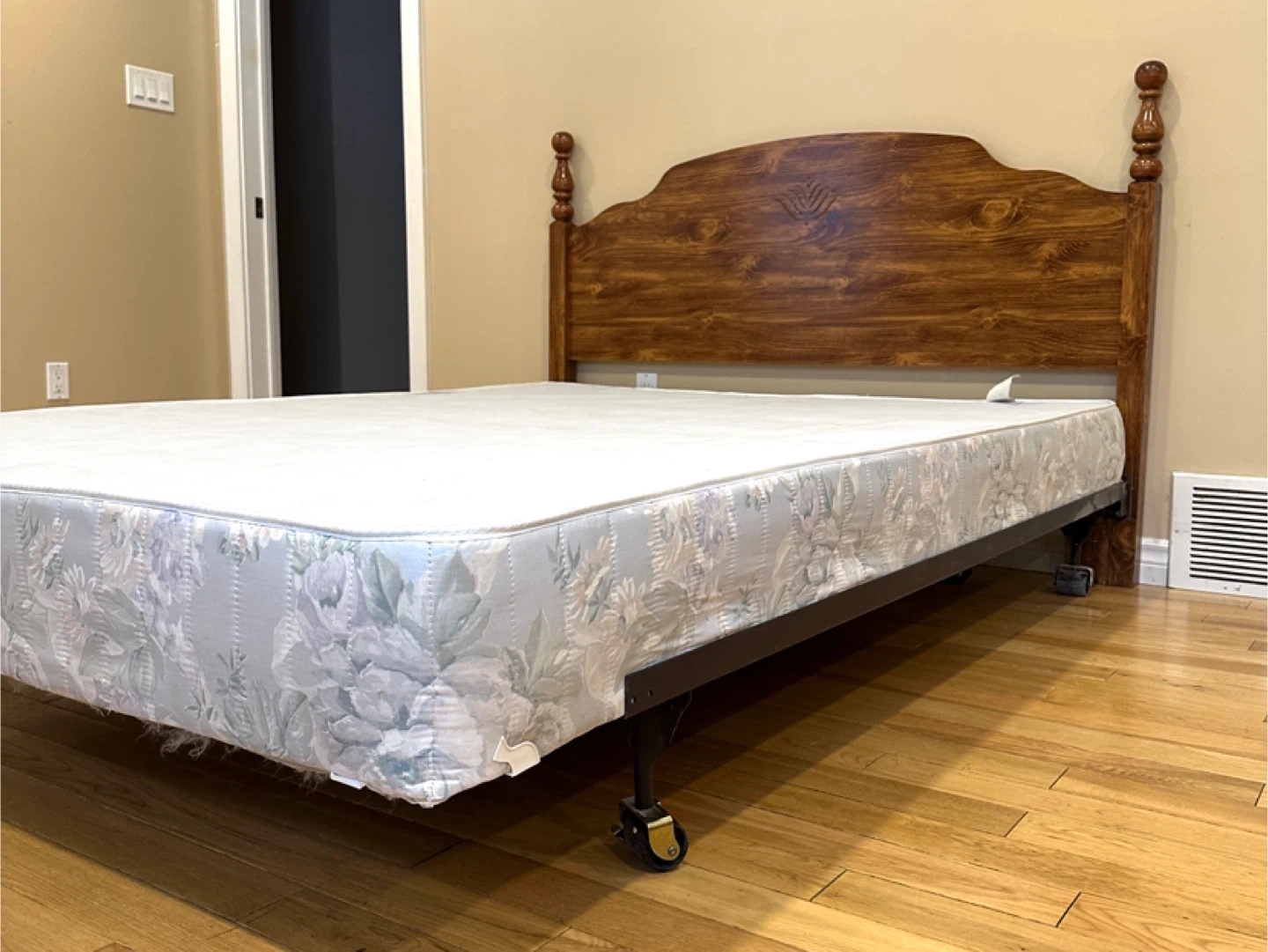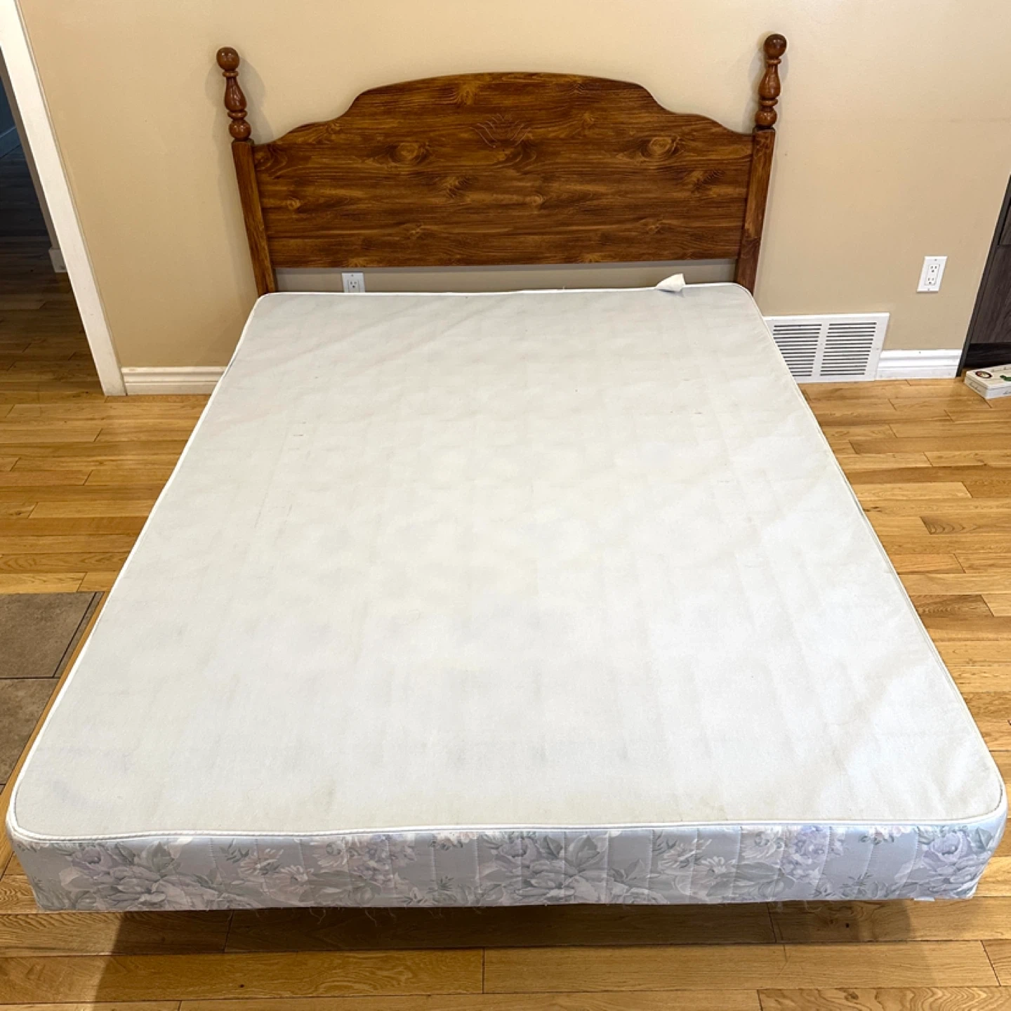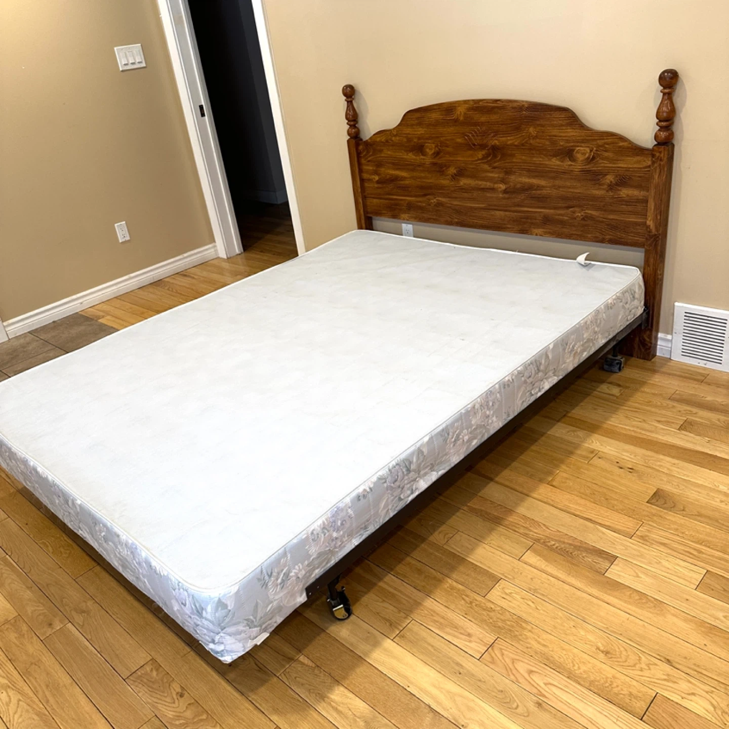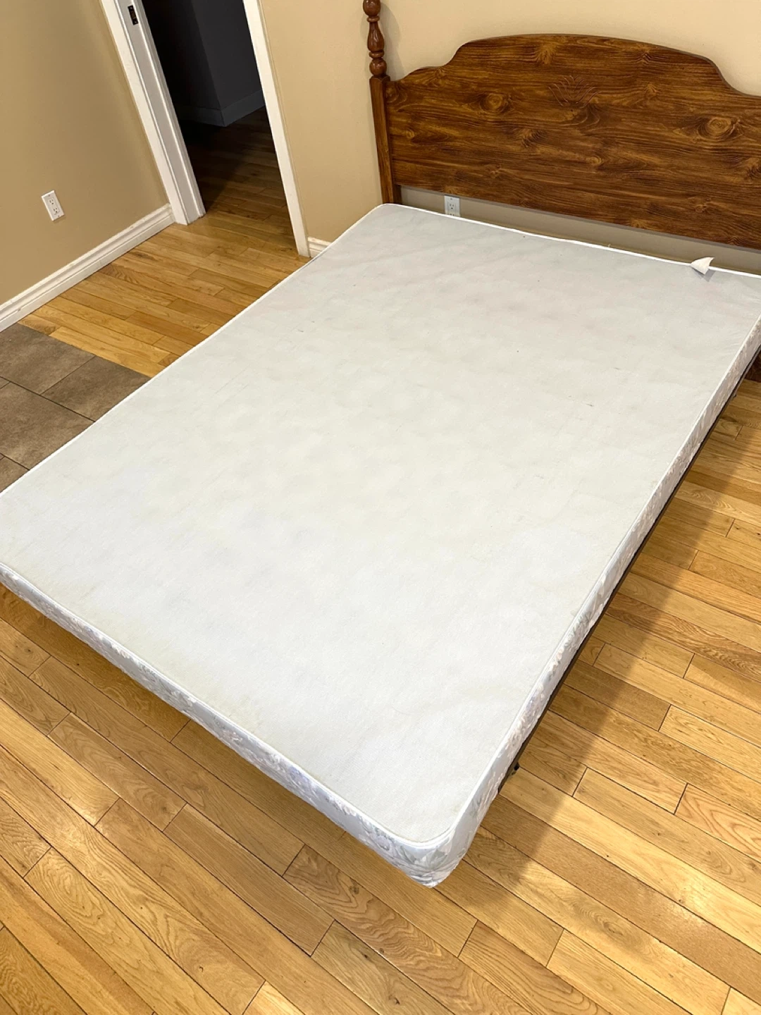 Selling a beautiful queen-size bed set in great condition. Includes a sturdy headboard, an adjustable metal bed frame, and a queen boxspring.