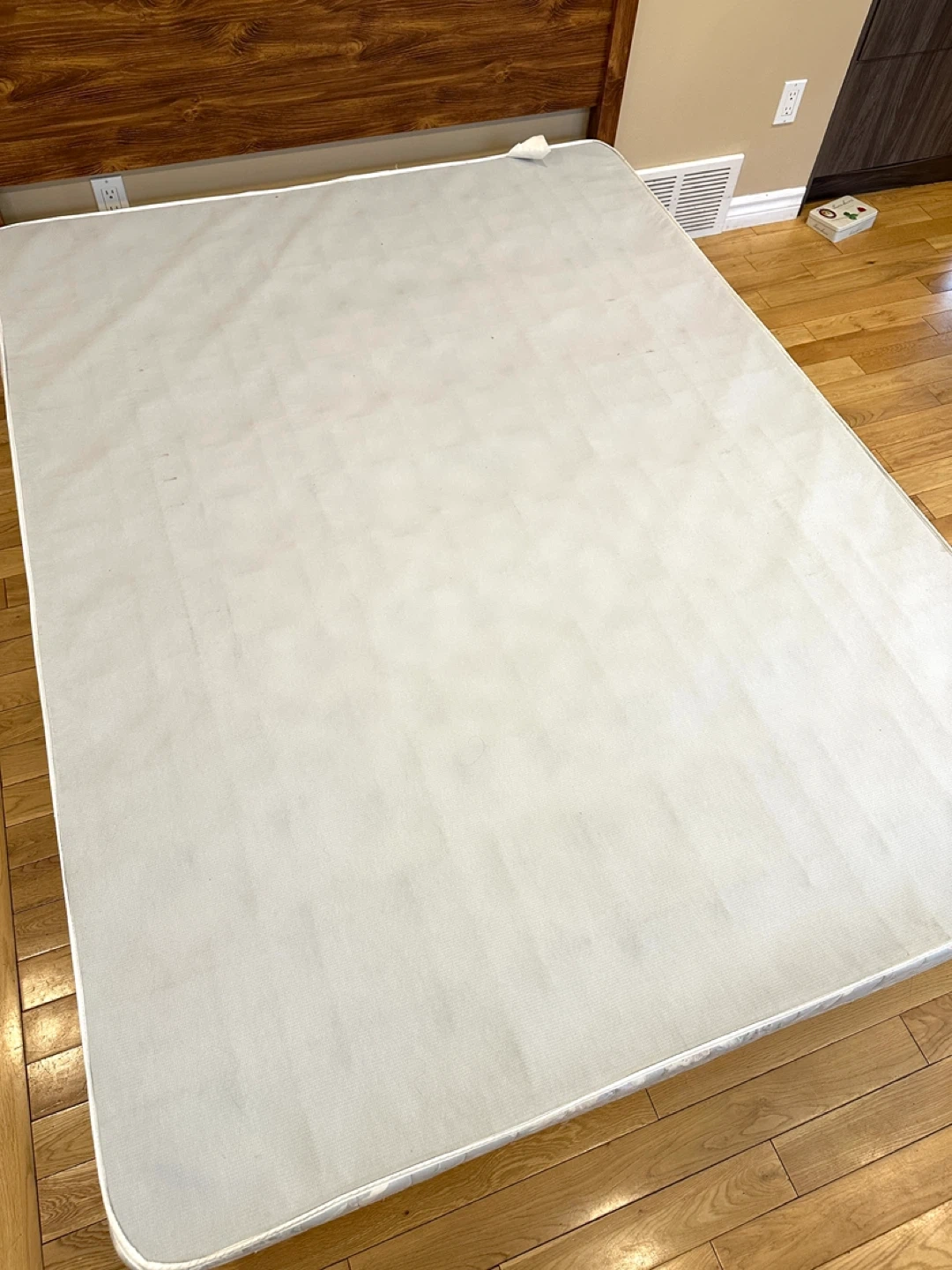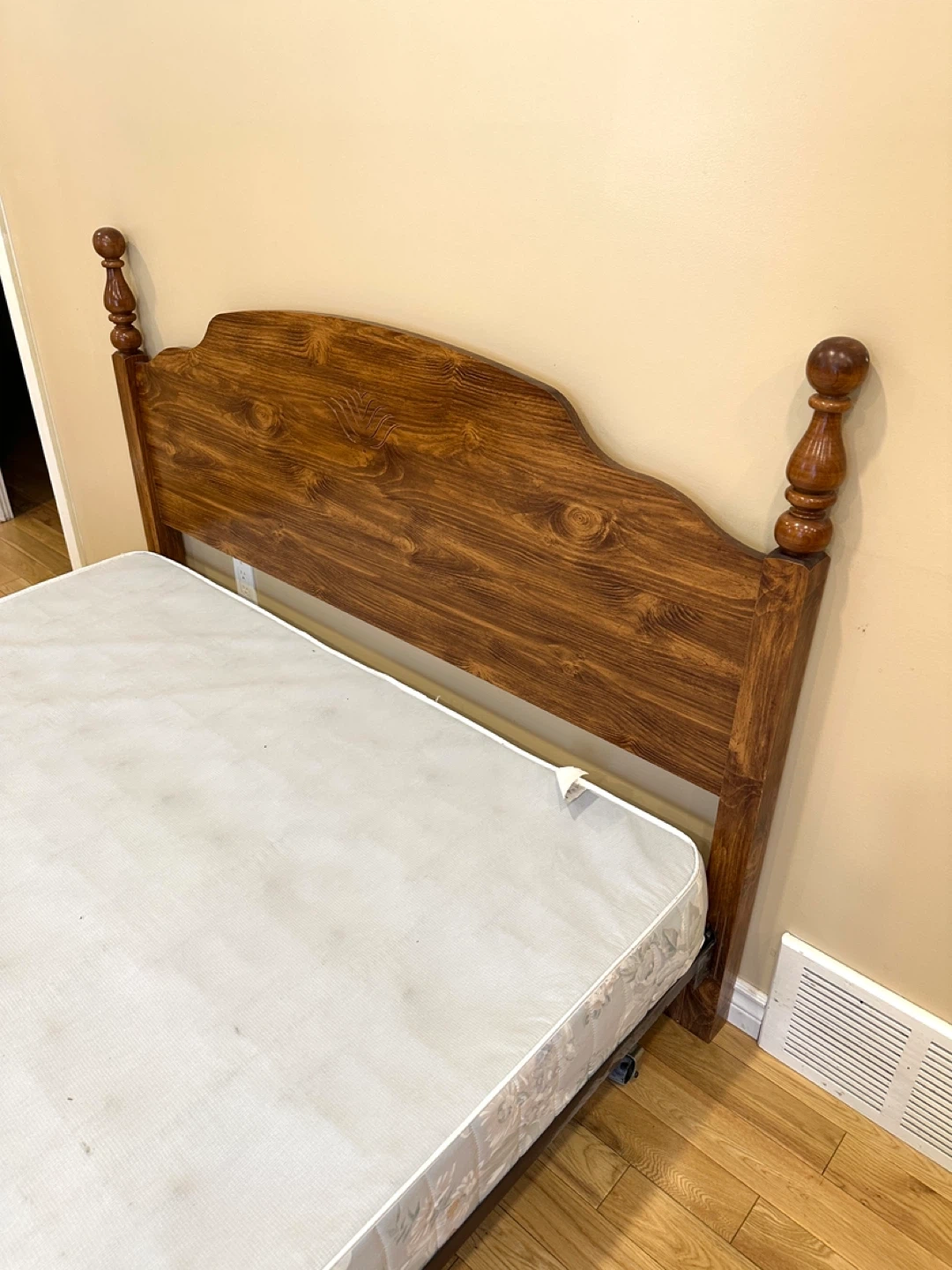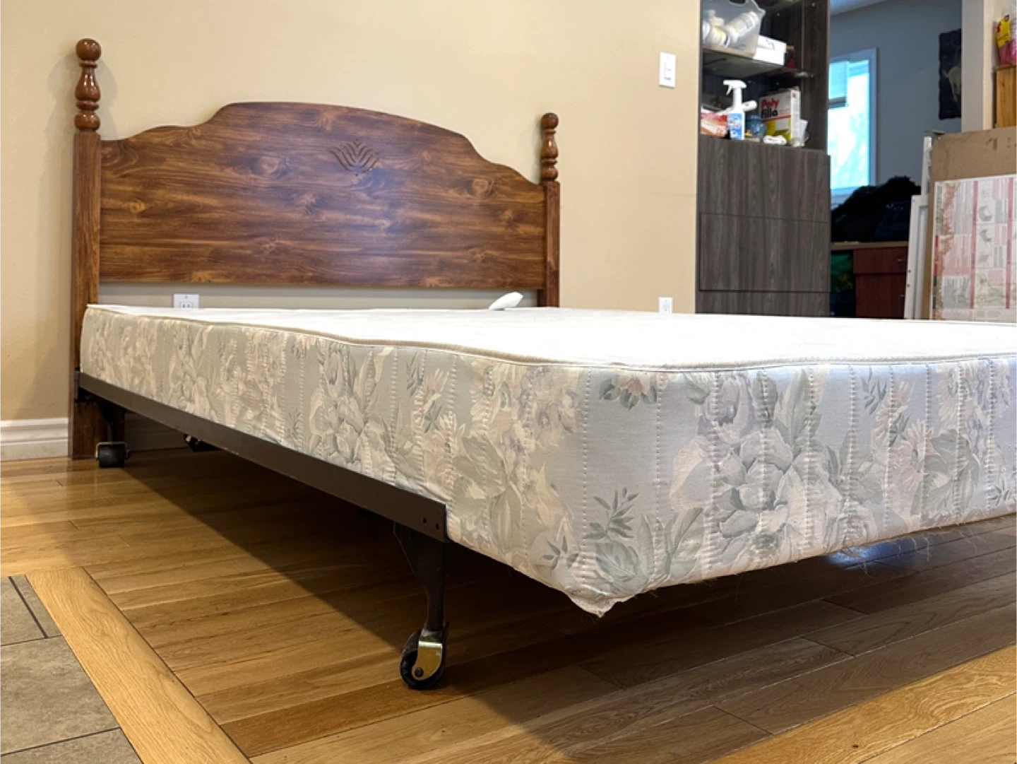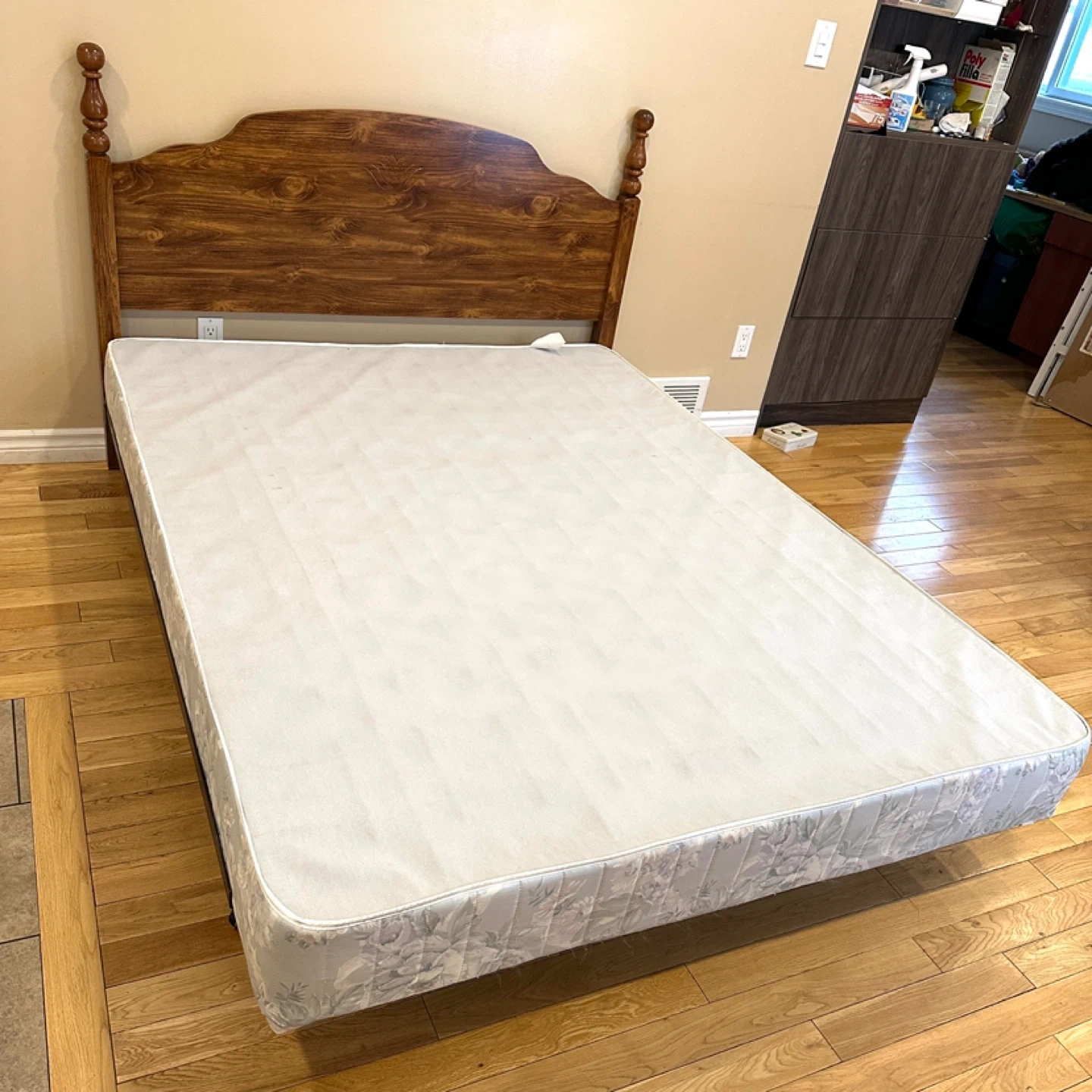 Selling a beautiful queen-size bed set in great condition. Includes a sturdy headboard, an adjustable metal bed frame, and a queen boxspring.