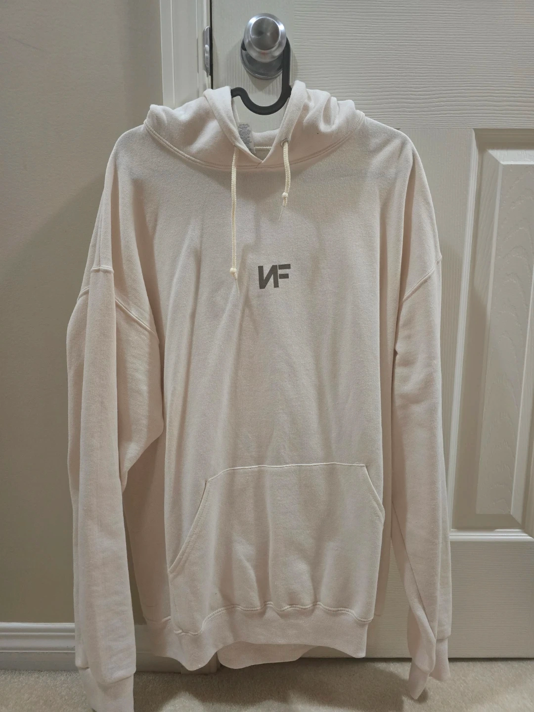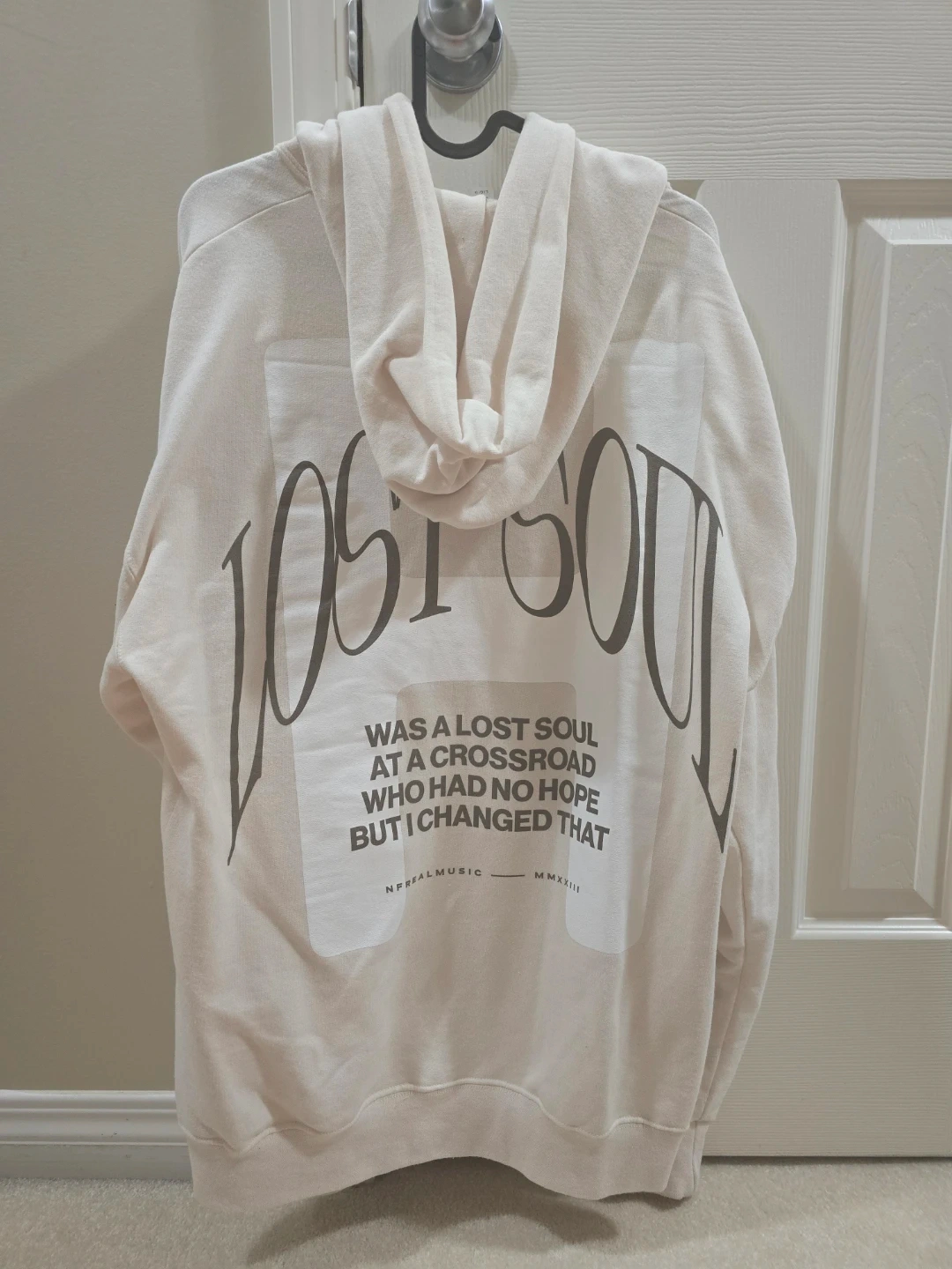 Selling a cream-coloured NF Lost Soul hoodie. It features the 'NF' logo on the front and the 'Lost Soul' design on the back. Great for any NF fan!