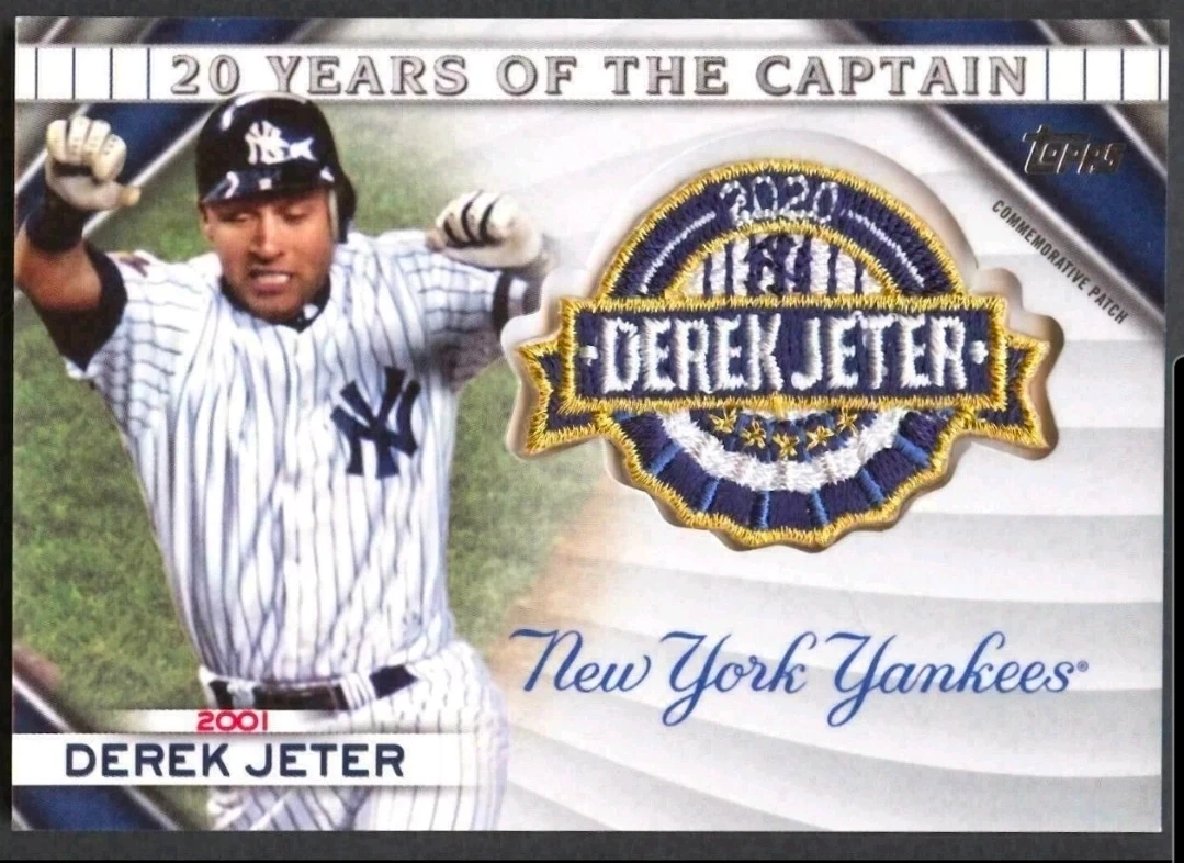 Selling a Topps commemorative patch card featuring Derek Jeter of the New York Yankees. It celebrates 20 years of the Captain and includes a 2020 commemorative patch. #20YCC-01
