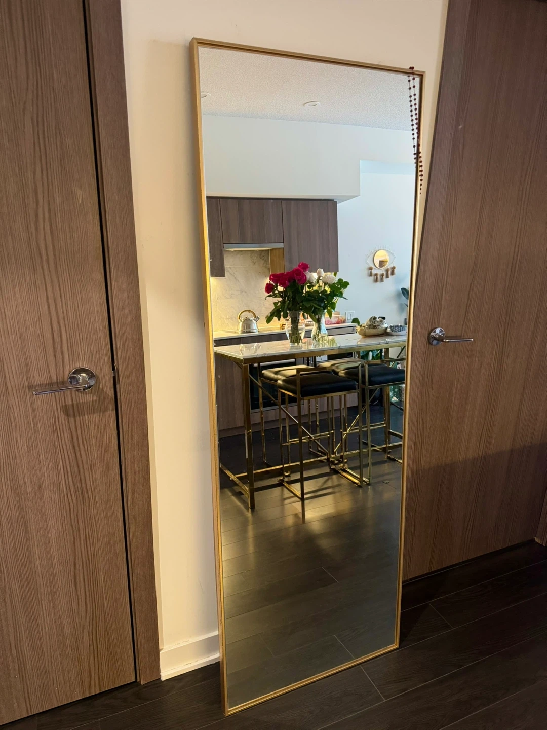 Selling a sleek, modern full-length mirror with a slim gold metal frame. Clean lines and a minimalist profile make it an easy fit for bedrooms, entryways, walk-in closets, or living spaces.