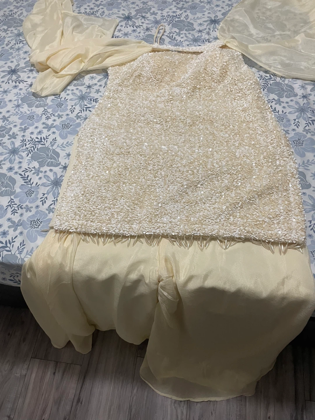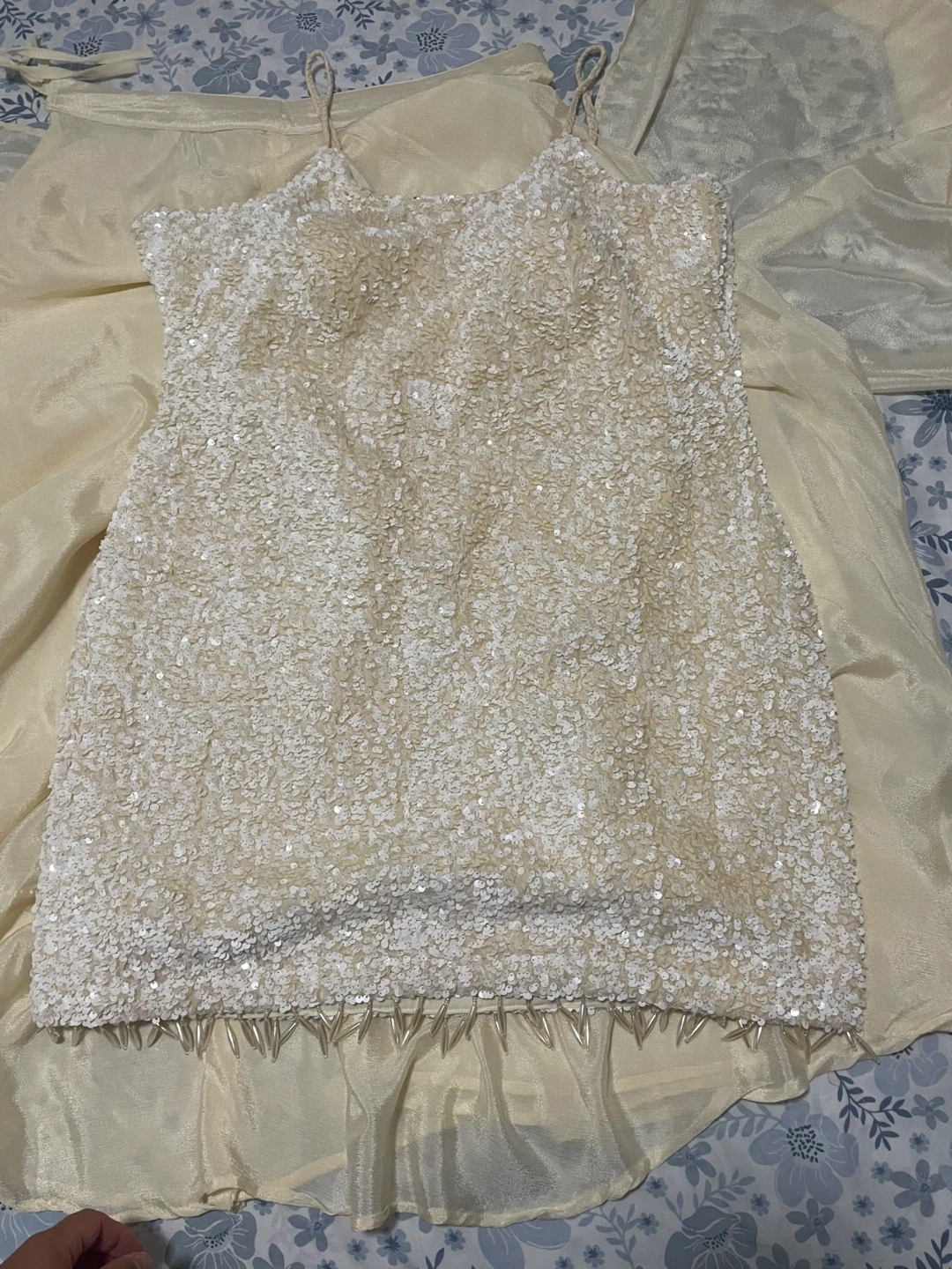 Selling a cream-coloured dress with beaded detailing. It's in good condition and has a unique, elegant look. Perfect for a special occasion or a night event!
