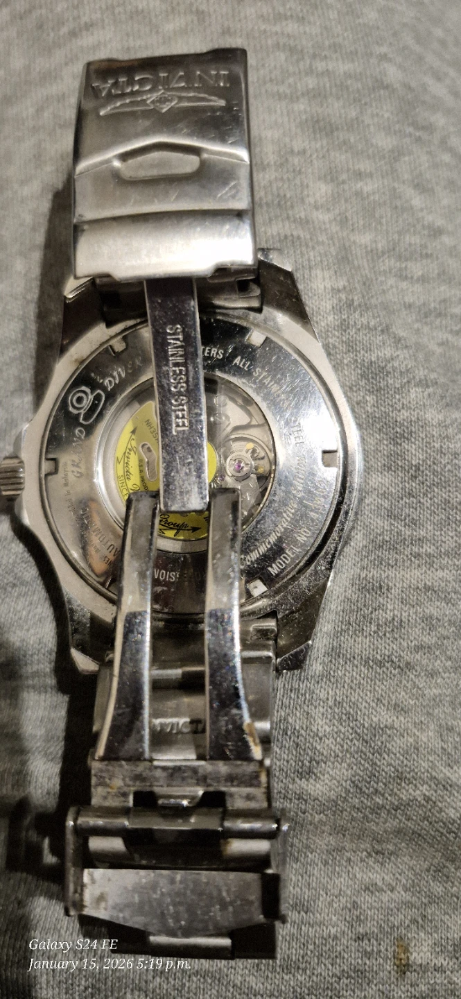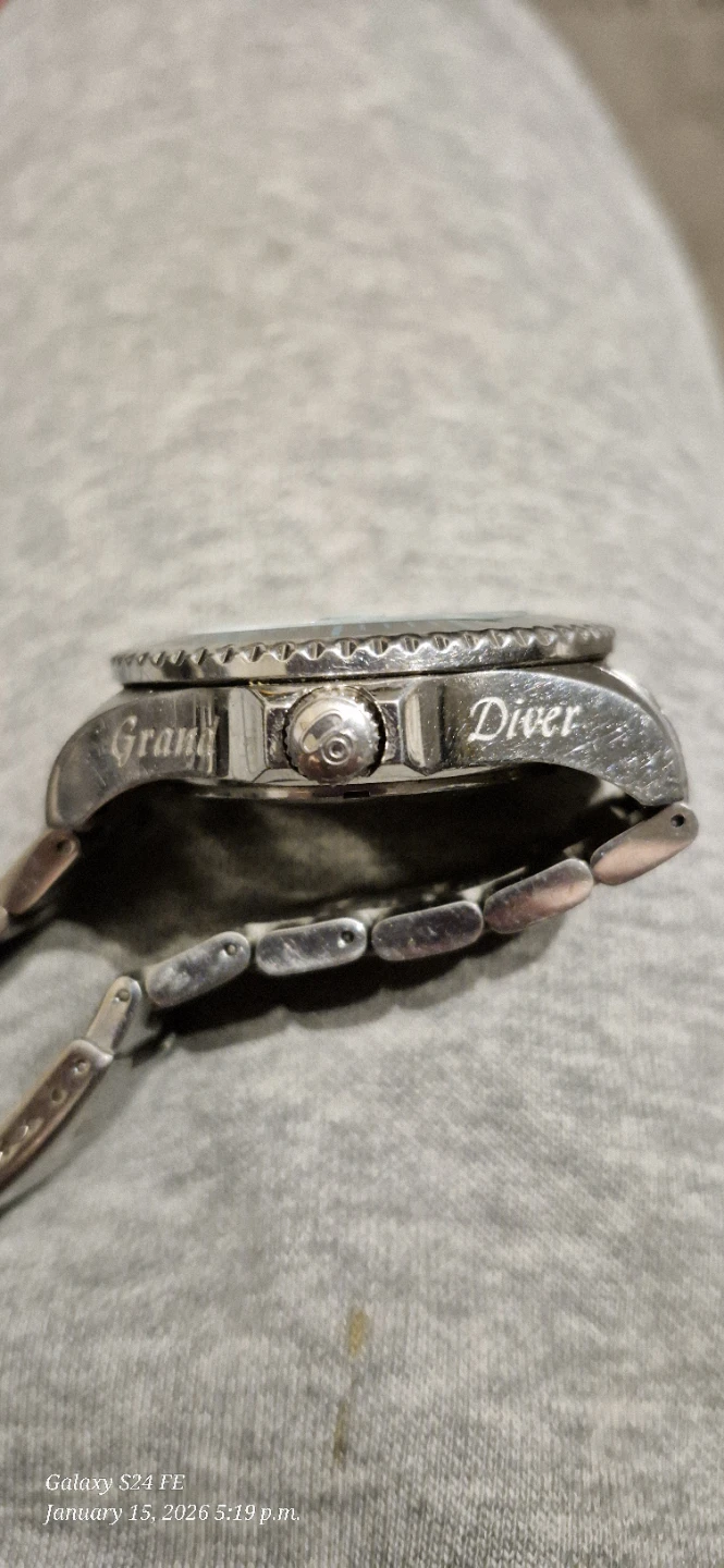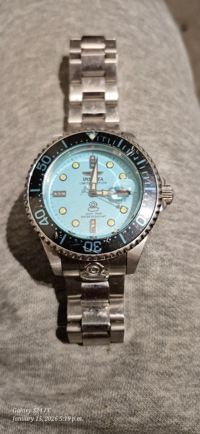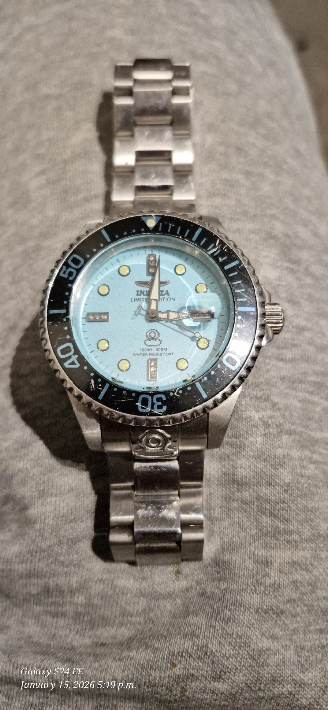 Selling a used Invicta Grand Diver automatic watch. It features a stainless steel band and a light blue face. It's water resistant to 300m. A stylish and functional timepiece!