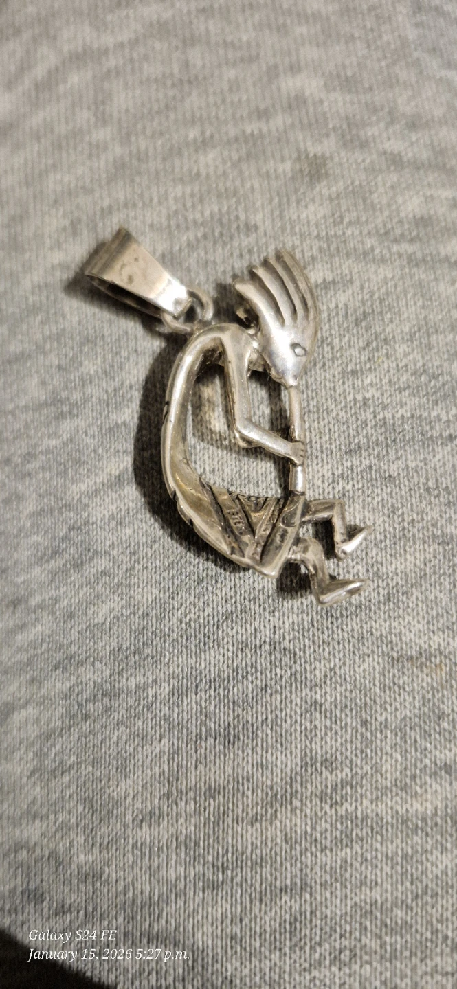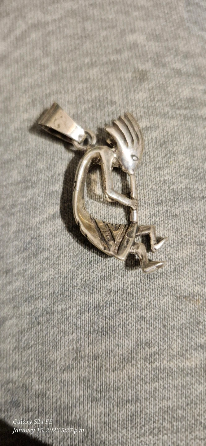 Here's a Kokopelli pendant made of sterling silver! The pendant features the figure of Kokopelli, a fertility deity, playing the flute. It's a unique piece that would look great with any outfit!