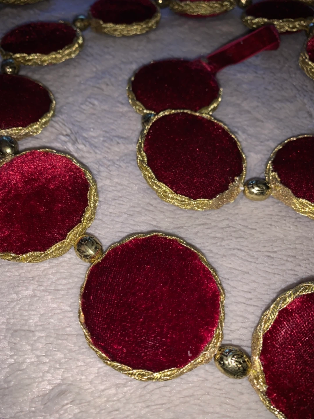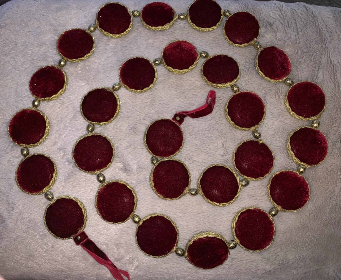 6 feet long. Velvet tassels at each end. Medallions are 2 inches wide. A beautiful decorative garland featuring deep red velvet circles edged with gold trim and gold-coloured beads. It's perfect for adding a touch of elegance to your home decor, especially for the holidays across a mantle or around a christmas tree.