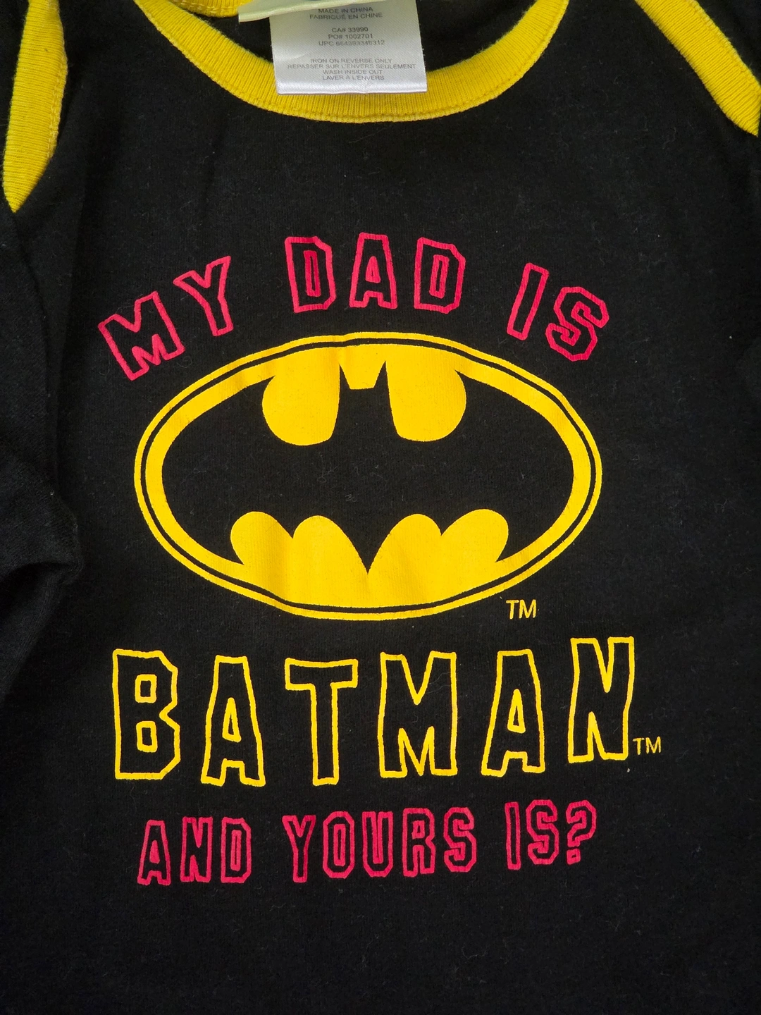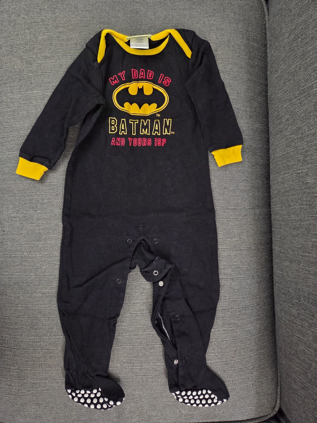 Neuf sans étiquette. Taille 12 à 18 mois. Combinaison, grenouillère, pyjama, body « Mon papa est Batman ».