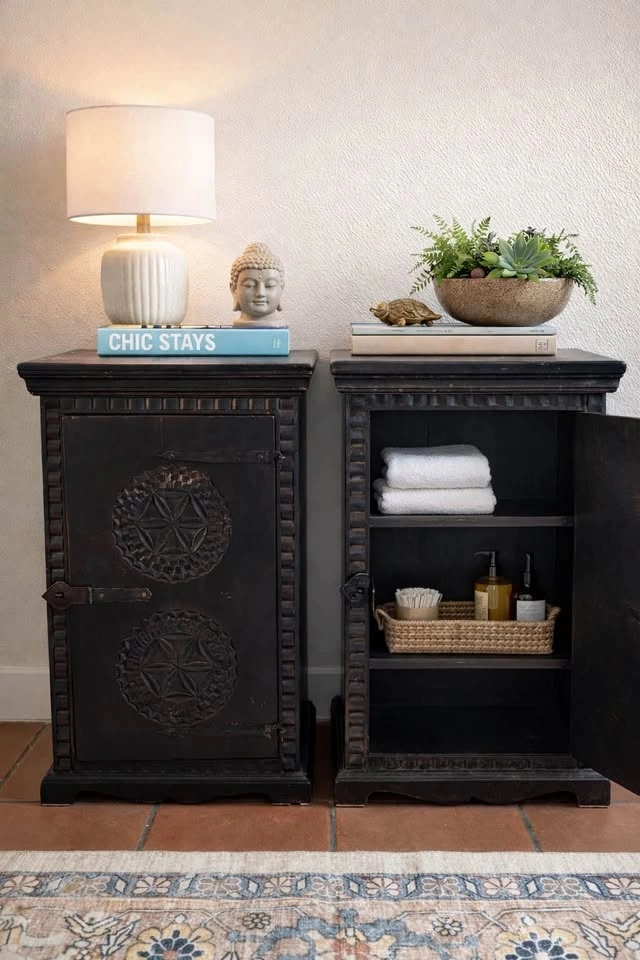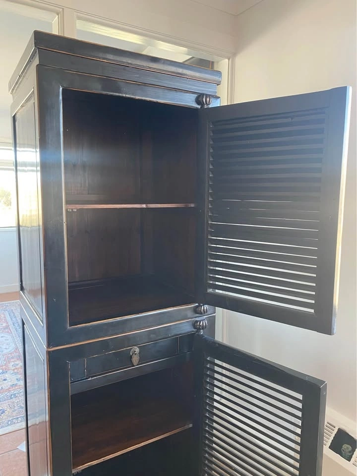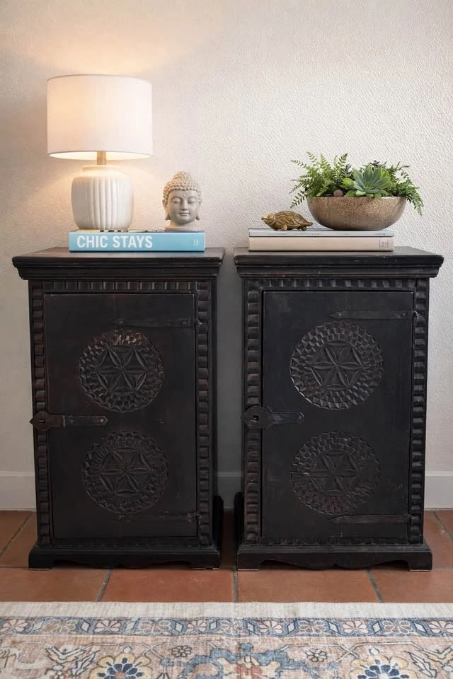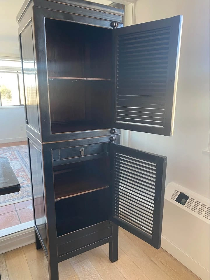 Beautiful, vintage solid wood furniture set from Moe’s Furniture featuring an Asian-inspired / antique black lacquer finish, brass hardware and distinctive hand carved details. Very solid construction and timeless design.