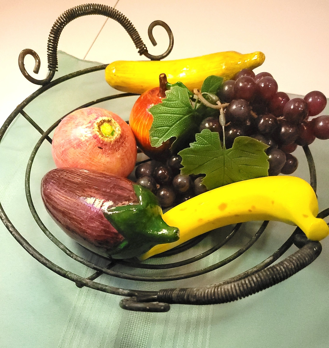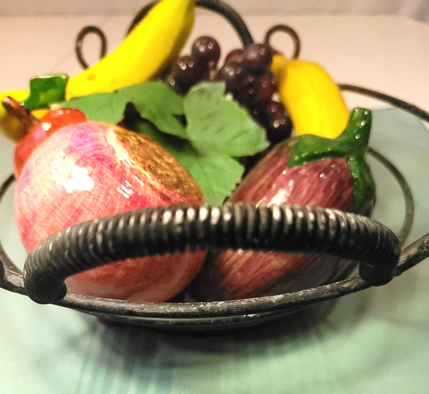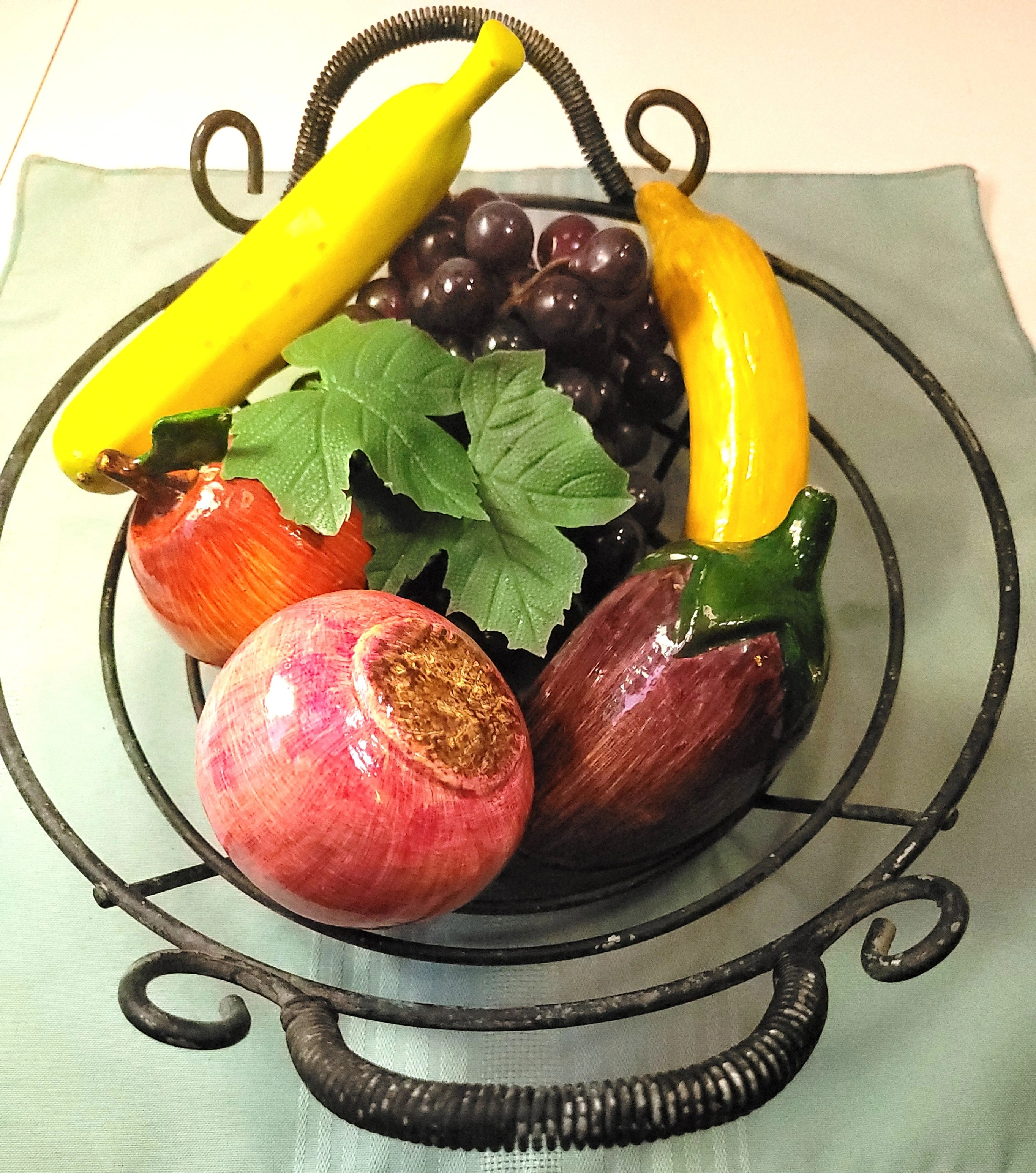 70s Wrought Iron Scroll Fruit Basket 6pc Lightweight Faux Fruit