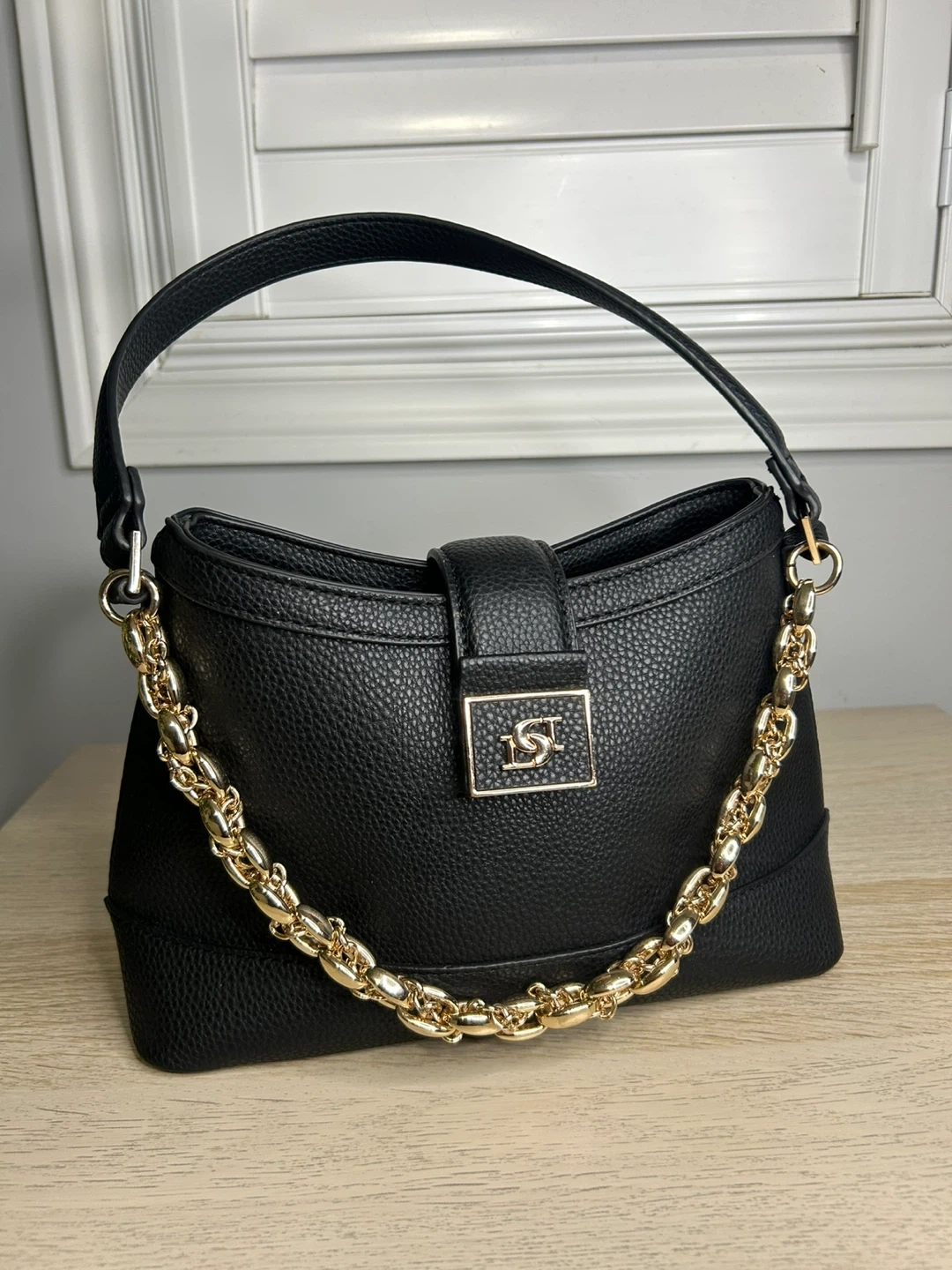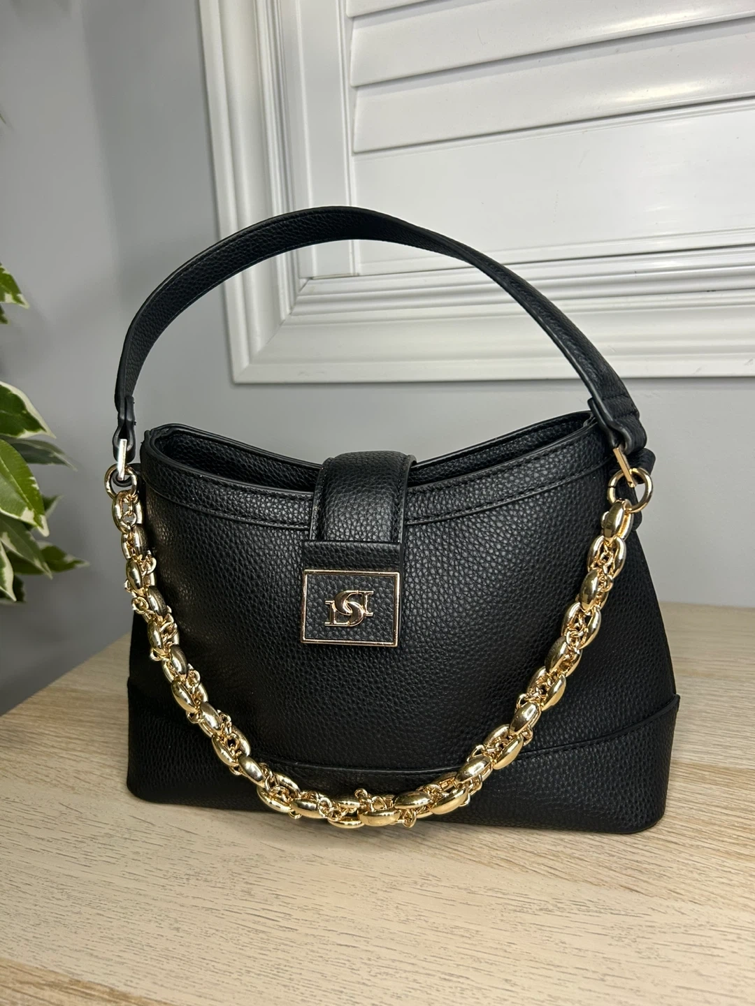 A stylish black DST handbag with a gold chain accent! It's in great condition and ready to elevate your look. The bag features a unique design with a secure closure and a comfortable handle. Perfect for adding a touch of elegance to any outfit