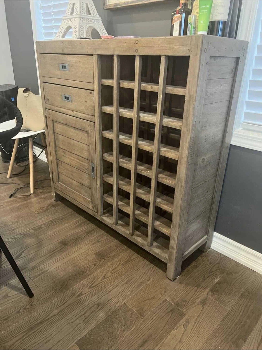 This driftwood wine cabinet holds up to 28 bottles. Lots of storage with 2 drawers and cabinet with a shelf. Excellent condition. Purchased for $700 + hst.