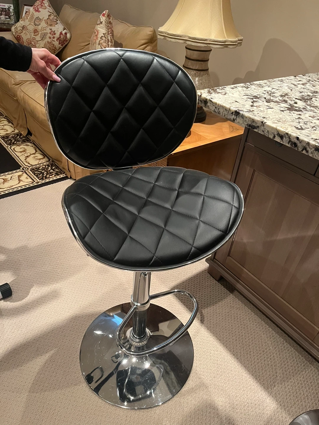 Selling a sleek, black bar stool with an adjustable height feature. It has a quilted pattern on the seat and backrest. The base and stand are chrome. It would be perfect for a kitchen island or bar area!