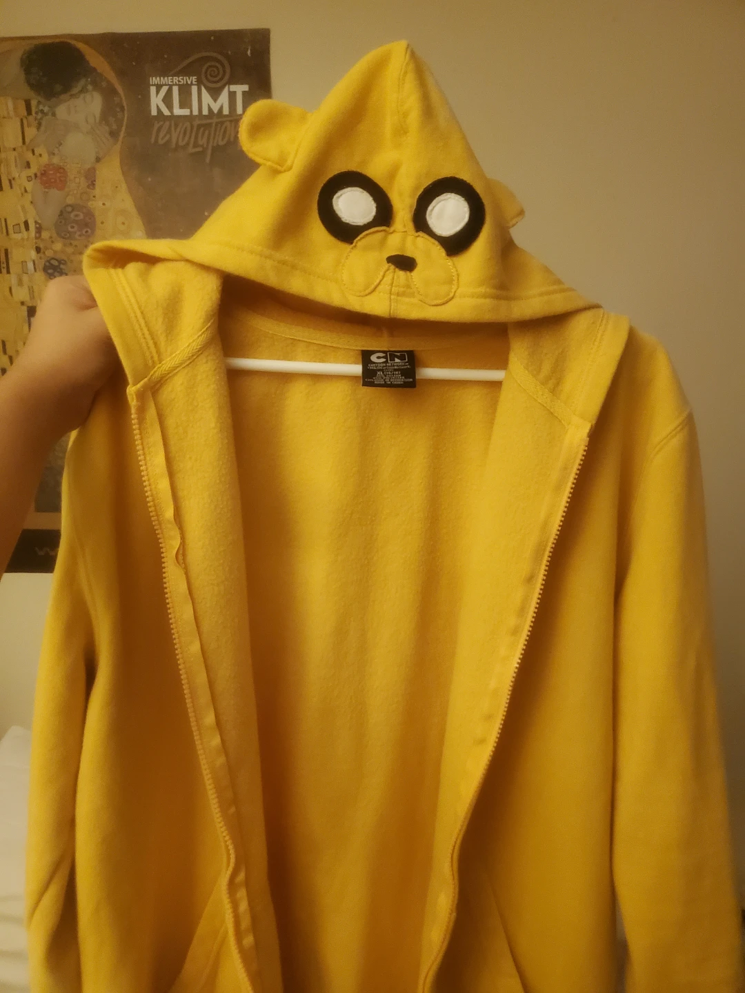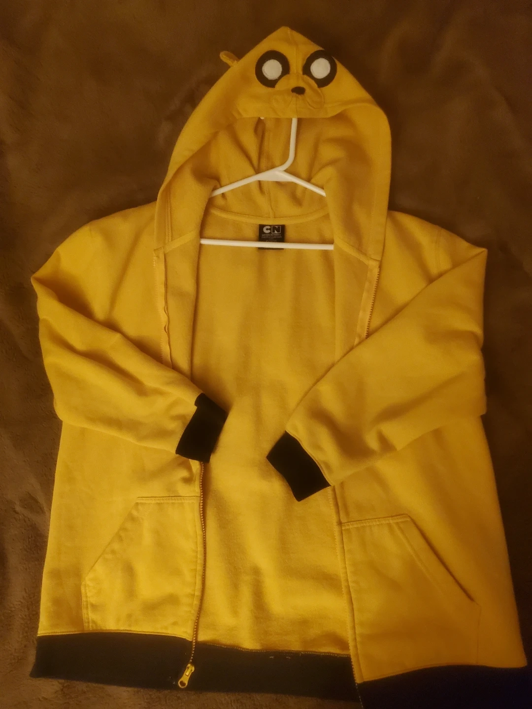 Selling a Cartoon Network Adventure Time Jake hoodie! It's a bright yellow colour with black detailing on the cuffs and bottom. It has Jake's face on the hood with little ears sticking out. Perfect for any Adventure Time fan!