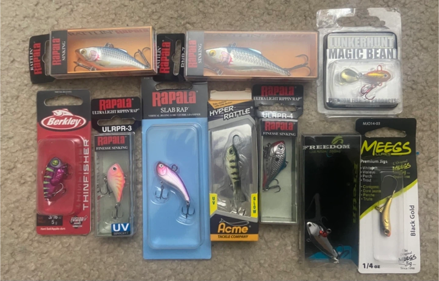 A selection of fishing lures from top brands! Included are Rapala, Berkley, Acme, Meegs, and Lunkerhunt lures. Perfect for walleye, perch, trout, and more!