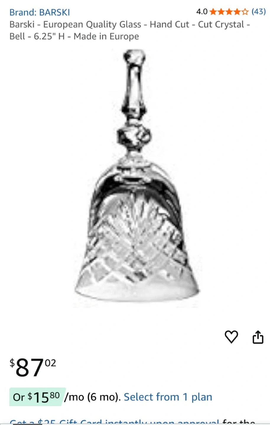 Buy & SellEuropean Quality Crystal BellEuropean Quality Crystal Bell$30Selling a beautiful European Quality Glass hand-cut crystal bell. Originally bought for $90ConditionNewDimensions7x4inchWHERE TO MEETCheck LocationView MapSELLERverifiedCindyBedford Park Nortown68253 reviews0 chats·0 favorites·7 viewsSEND CHAT TO SELLERHi Cindy! I’m interested in your listing.Hi Cindy! I’m interested in your listing.Get the Karrot app to chatSign In to chat
