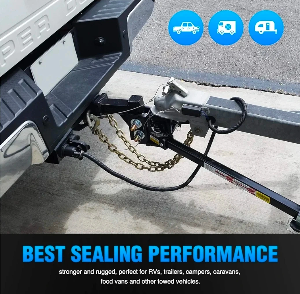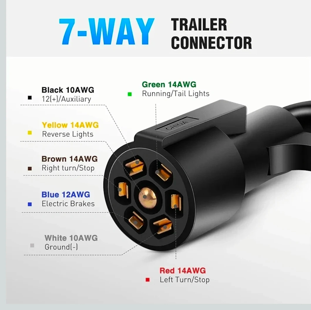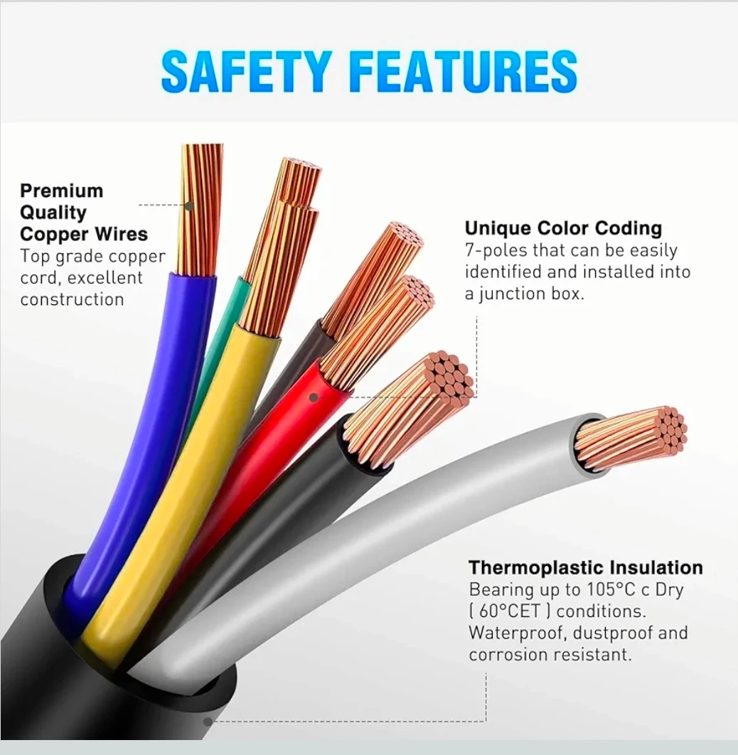 Selling a Nilight 50049R 7-Way Heavy Duty Trailer Plug Inline Trailer Cord. This is an 8-foot cable designed for truck campers and RVs. It's made with blade molded RV cable wire and is waterproof and corrosion resistant. The connector features double spades and uses pure copper wire cores with premium PVC housing for tougher and safer connections. The wires are color-coded for easy installation into a junction box.