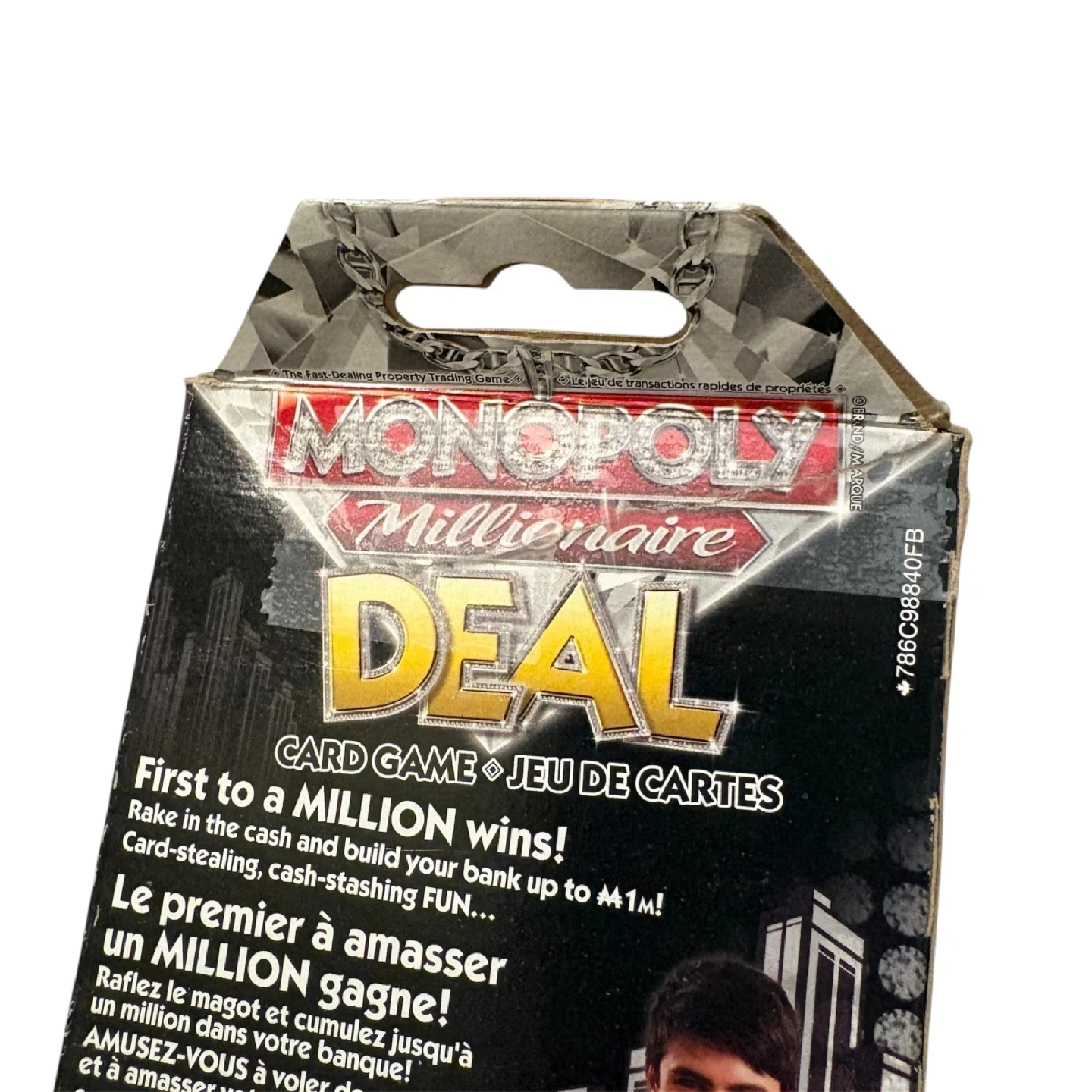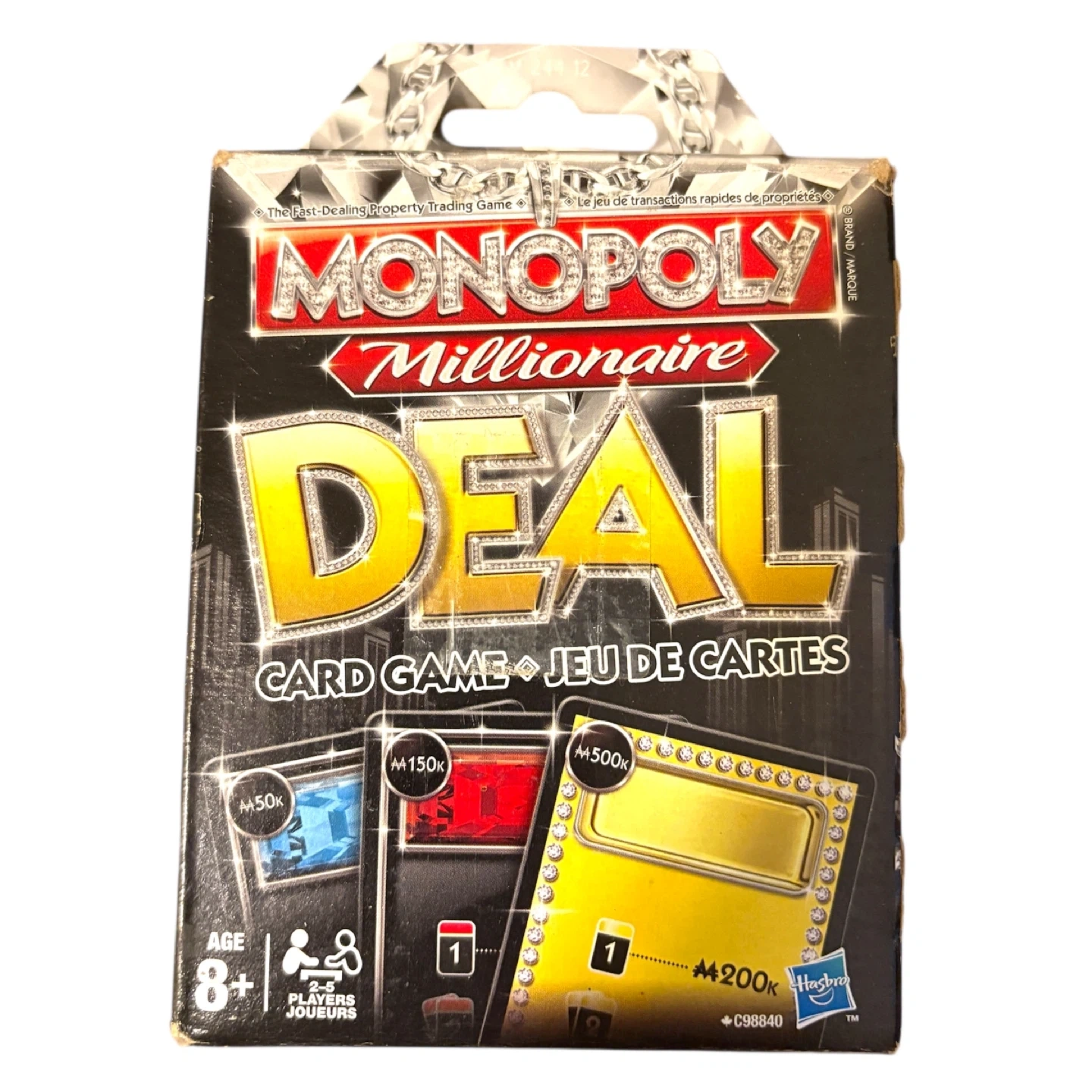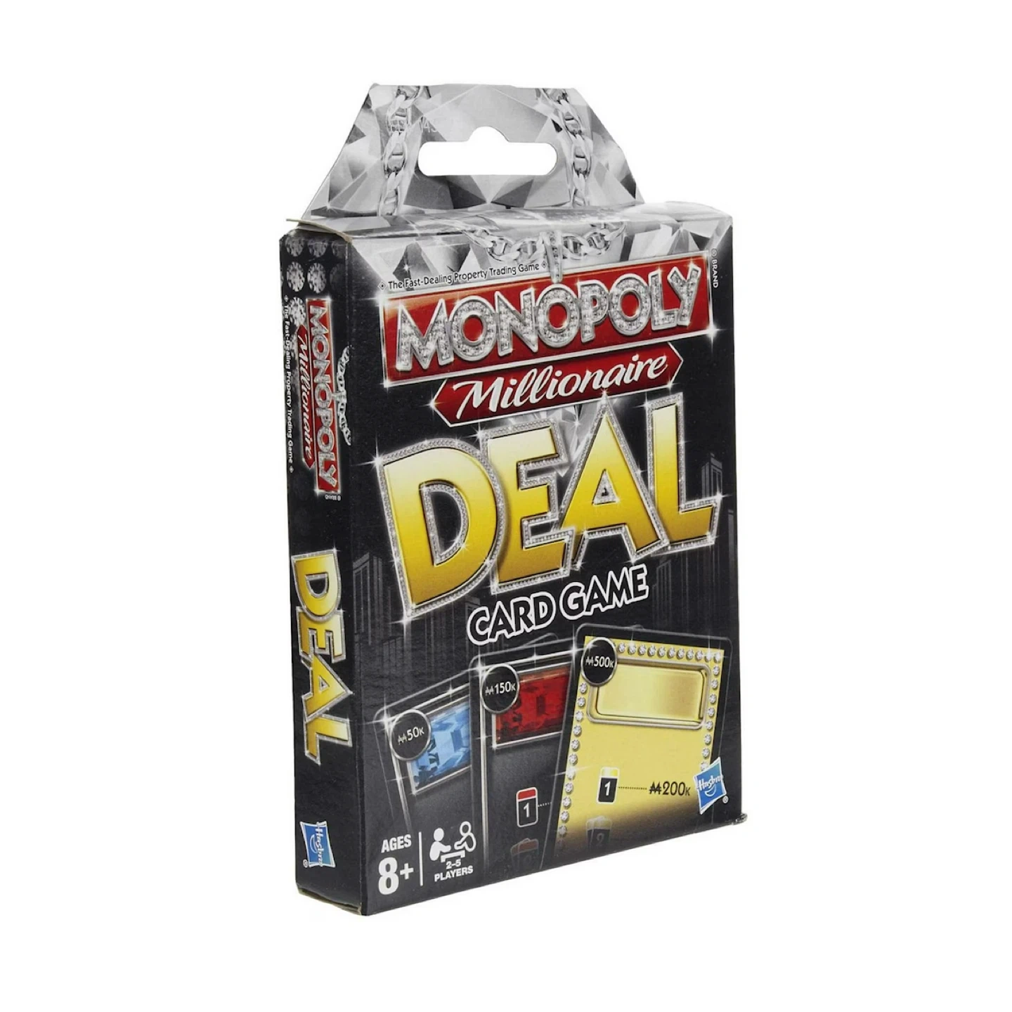 "It's a brand new way to play the classic property trading game! Be the first in this card game to get a million dollars in your bank pile and win MONOPOLY Millionaire Deal! Pick up cards when it's your turn and play any combination of Money, Action and Property cards. Don't hesitate to steal a property or set of properties from another player if you get the right action cards, but hang on to the Just Say No card in case someone tries to do the same to you! Build up property sets, gather piles of money and keep wheeling and dealing to make that million!