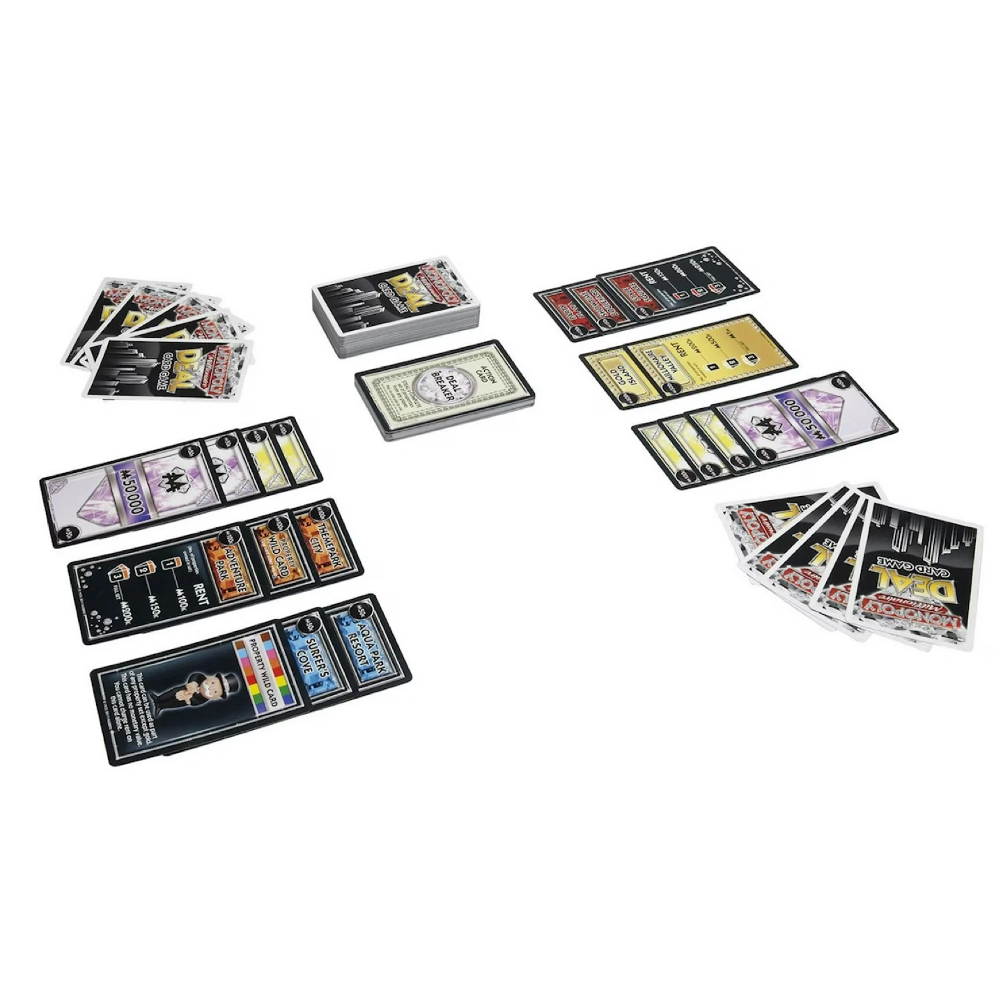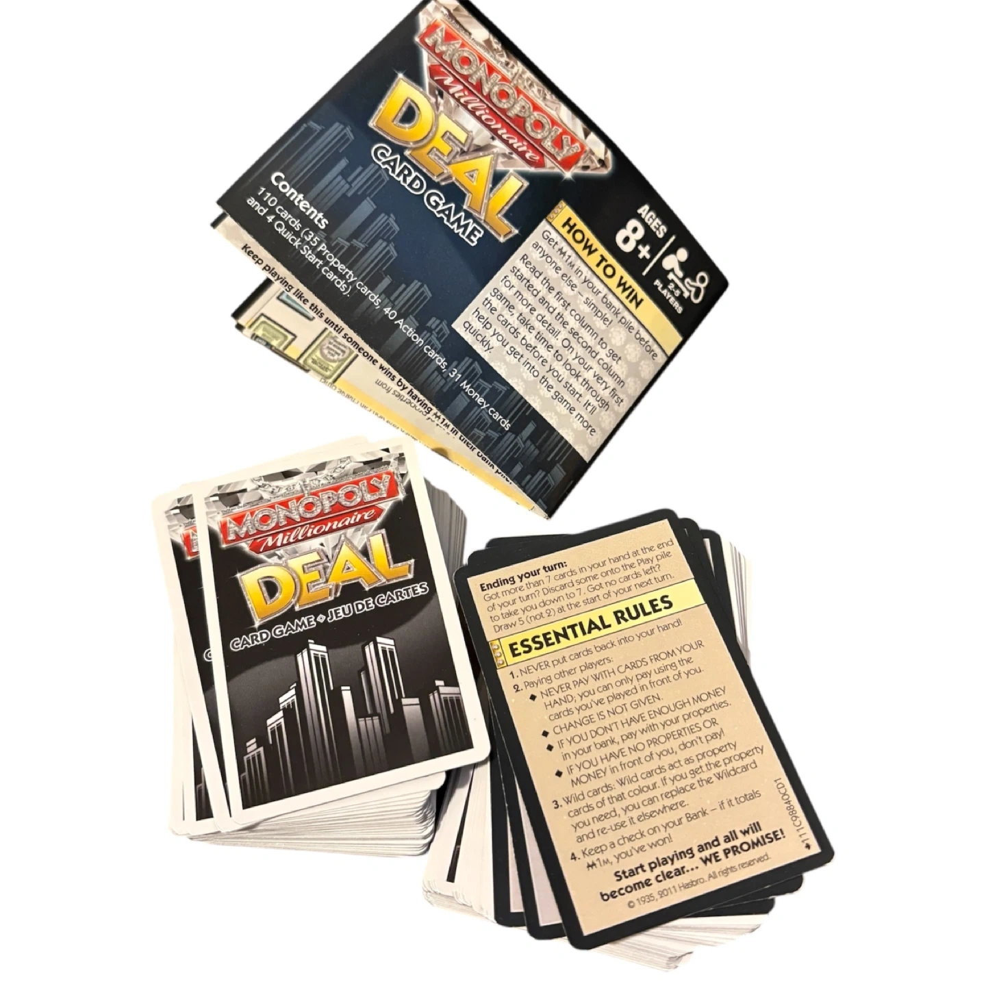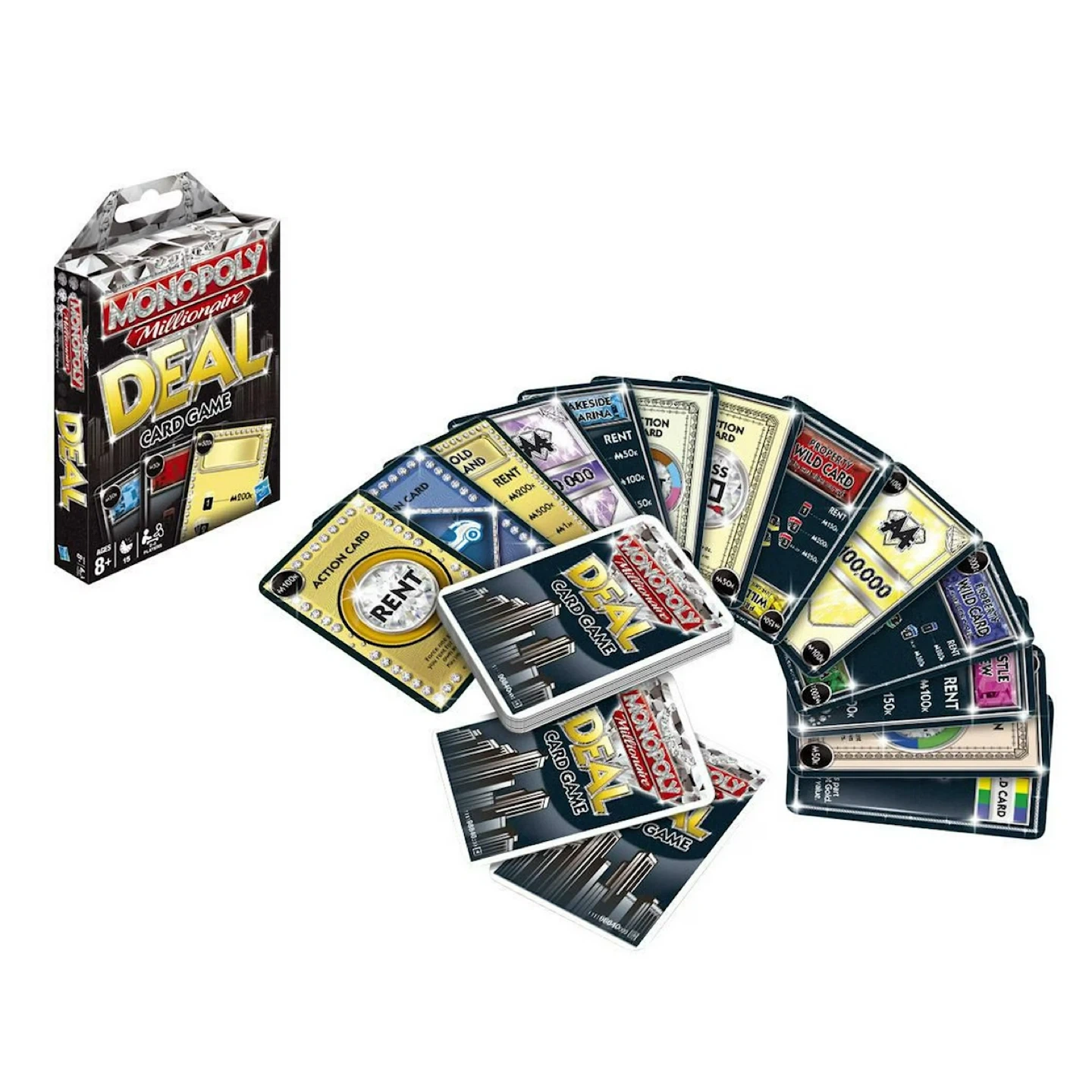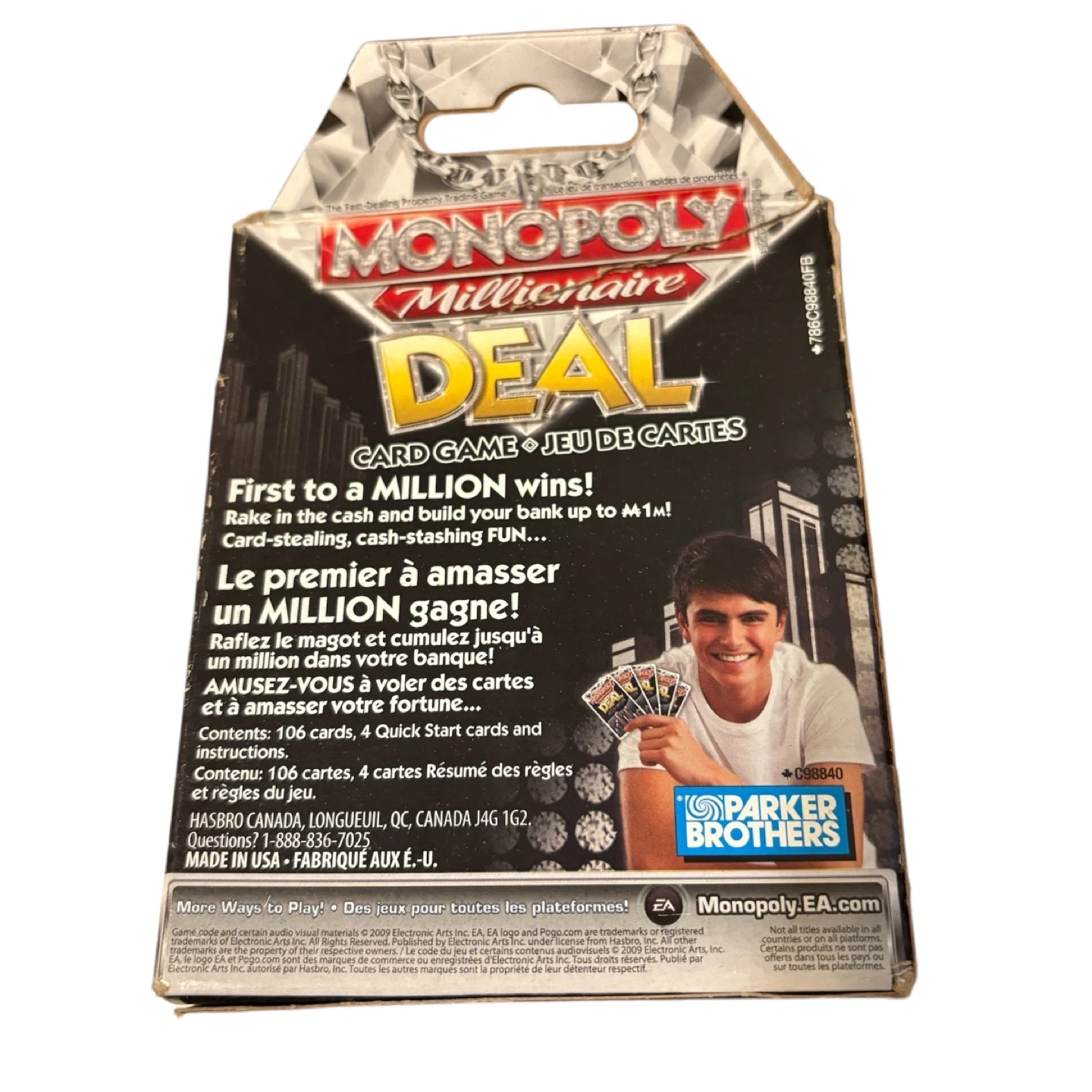 "It's a brand new way to play the classic property trading game! Be the first in this card game to get a million dollars in your bank pile and win MONOPOLY Millionaire Deal! Pick up cards when it's your turn and play any combination of Money, Action and Property cards. Don't hesitate to steal a property or set of properties from another player if you get the right action cards, but hang on to the Just Say No card in case someone tries to do the same to you! Build up property sets, gather piles of money and keep wheeling and dealing to make that million!