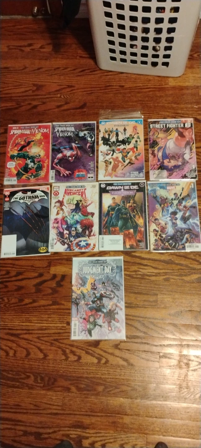Selling a collection of comic books, including titles from Marvel and DC. You'll find Spider-Man/Venom, Dawn of DC Primer, Street Fighter, Gotham War, Uncanny Avengers, Dawn of DC Knight Terrors, and Judgment Day. A great mix for any comic enthusiast!
