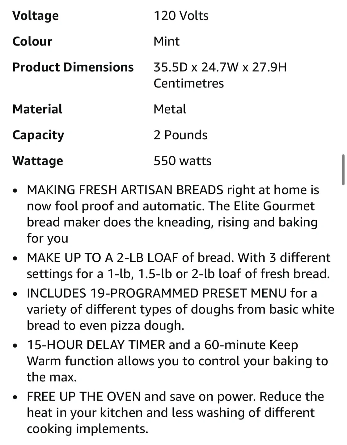 Elite Gourmet 2-Pound Bread Maker - Mint