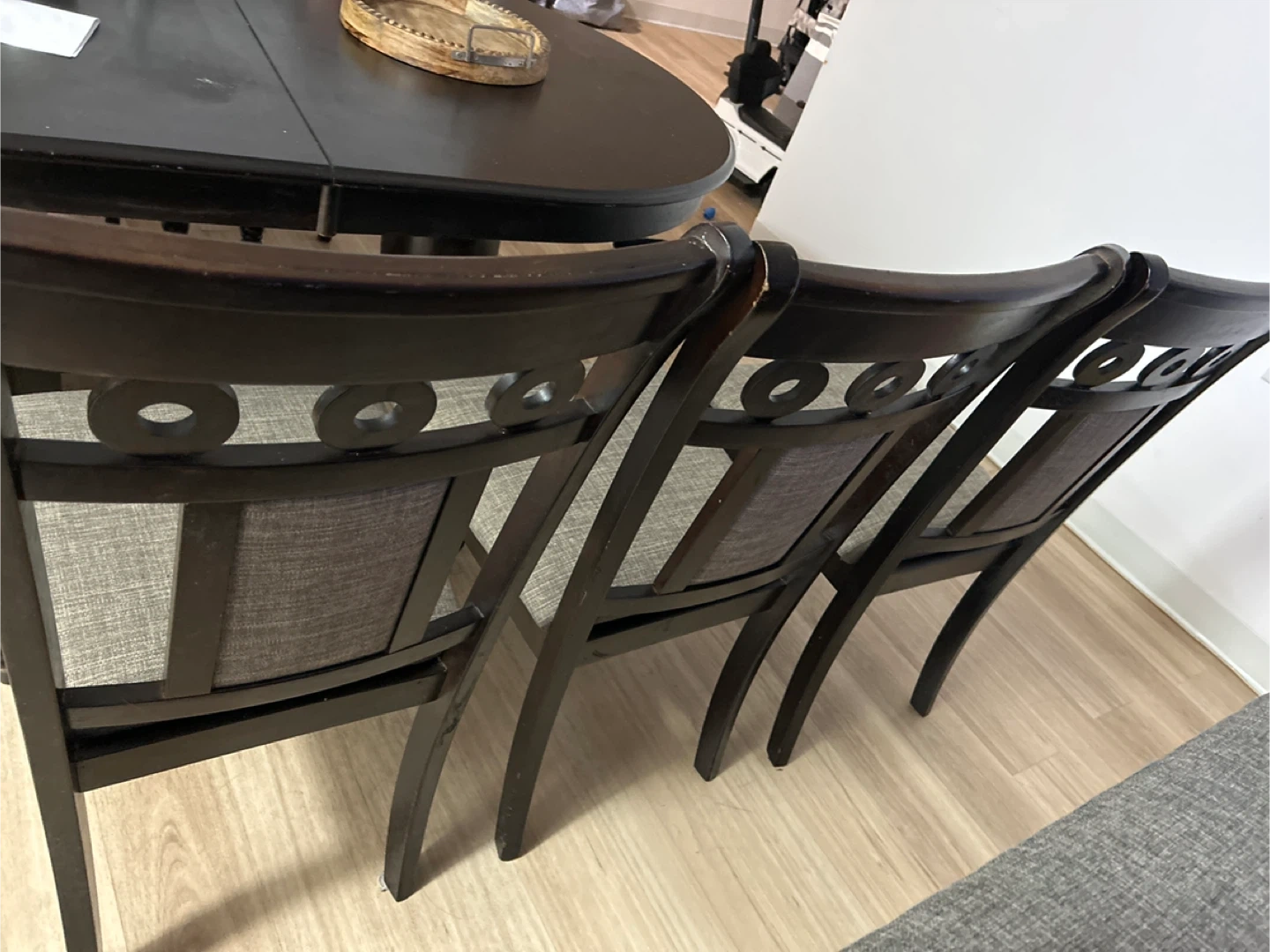 Selling a set of 3 dining chairs. They have a dark wood frame and neutral-colored fabric seats. Perfect for adding extra seating to your dining area!