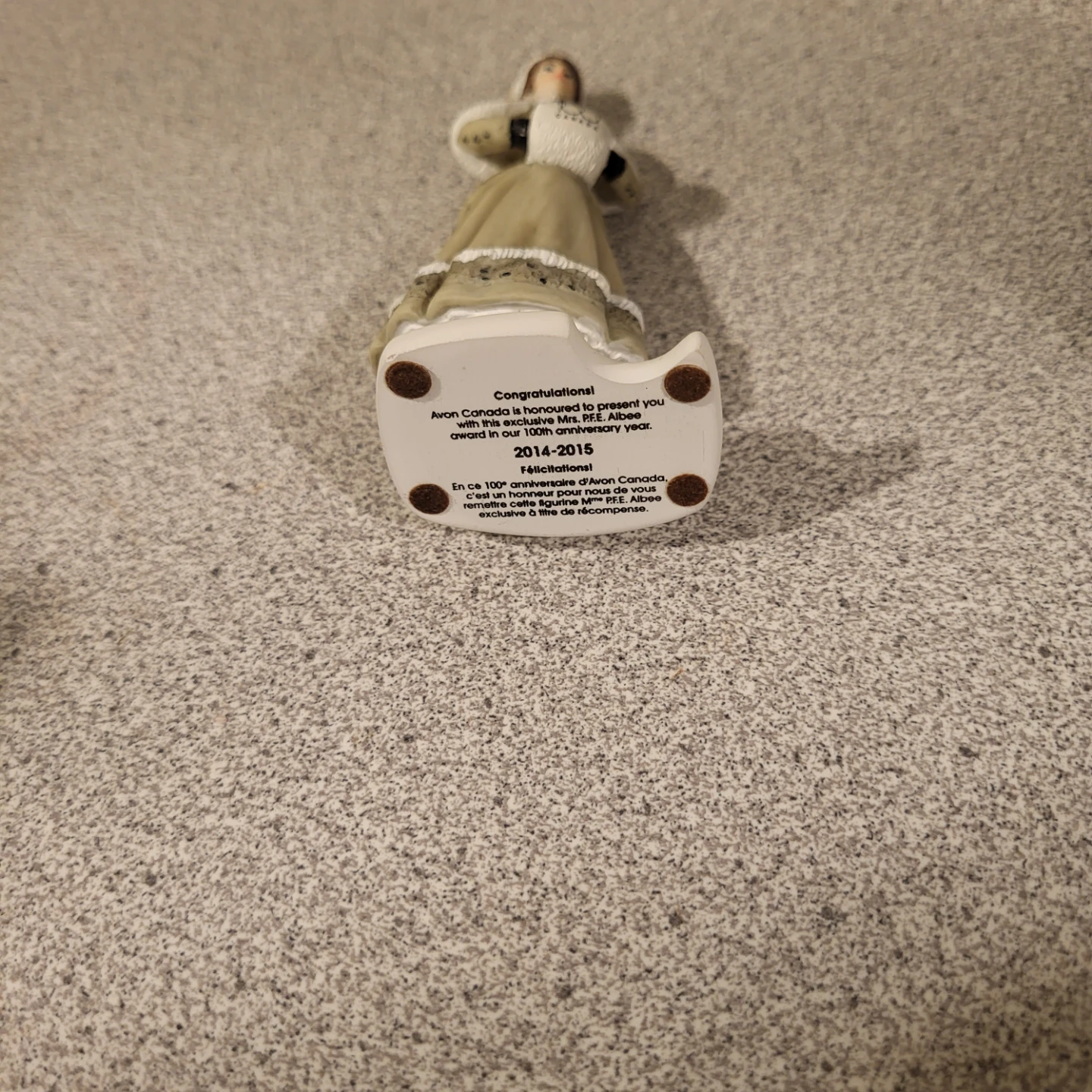 This is an Avon 100th anniversary figurine. It appears to be in good condition. The bottom of the figurine says it was an exclusive Mrs. R.E. Albee award in our 100th anniversary year, 2014-2015