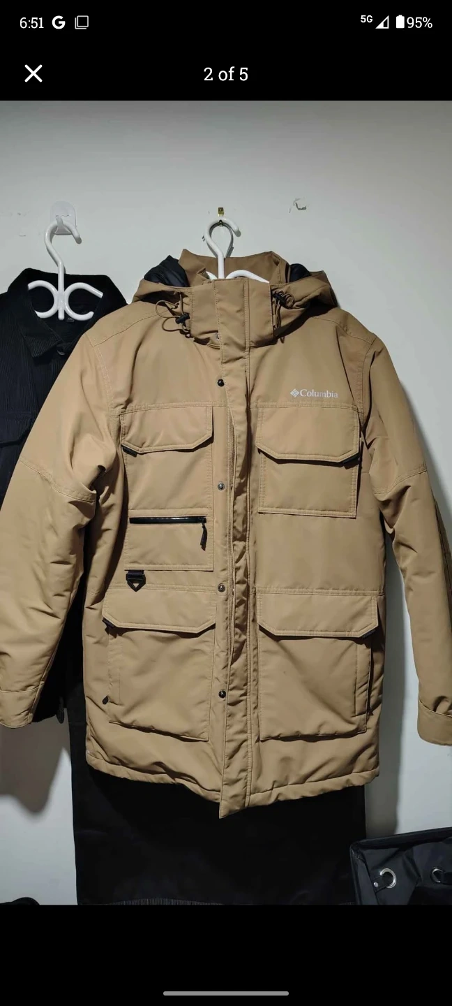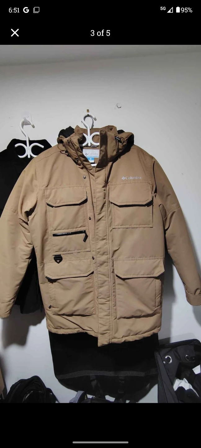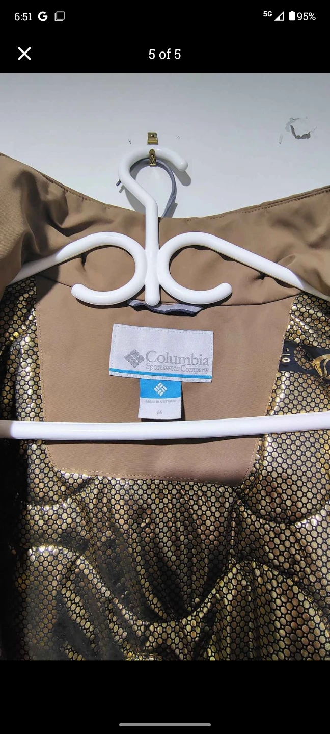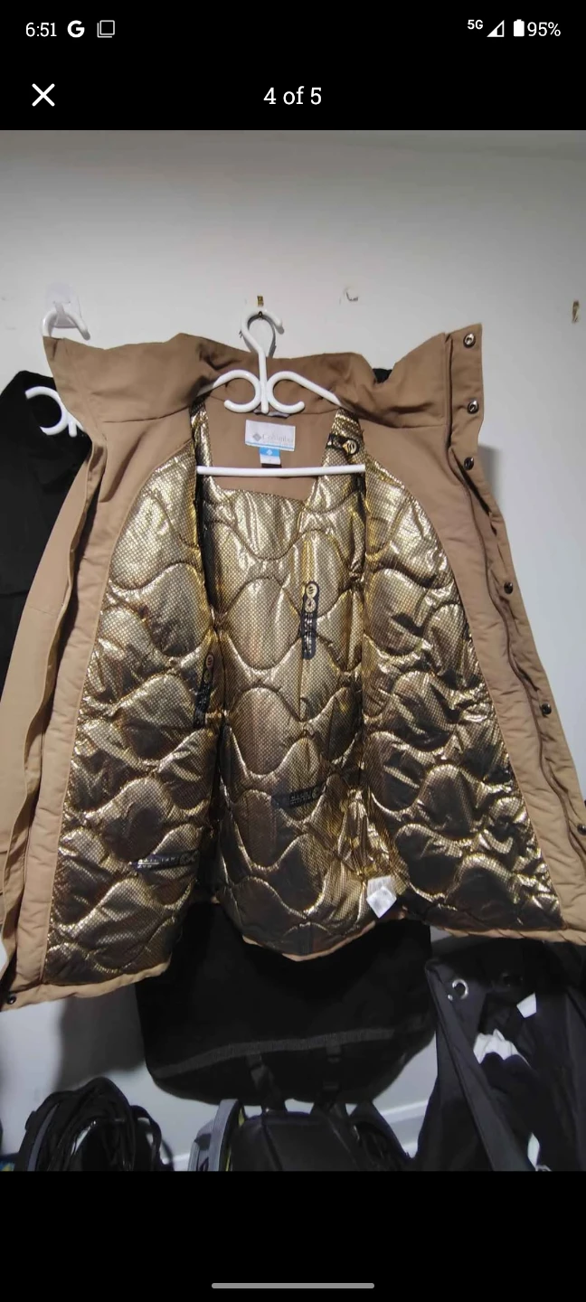 It's in great condition and ready for the colder weather. The jacket features a gold-coloured inner lining and a tan outer shell. Perfect for staying warm and stylish!