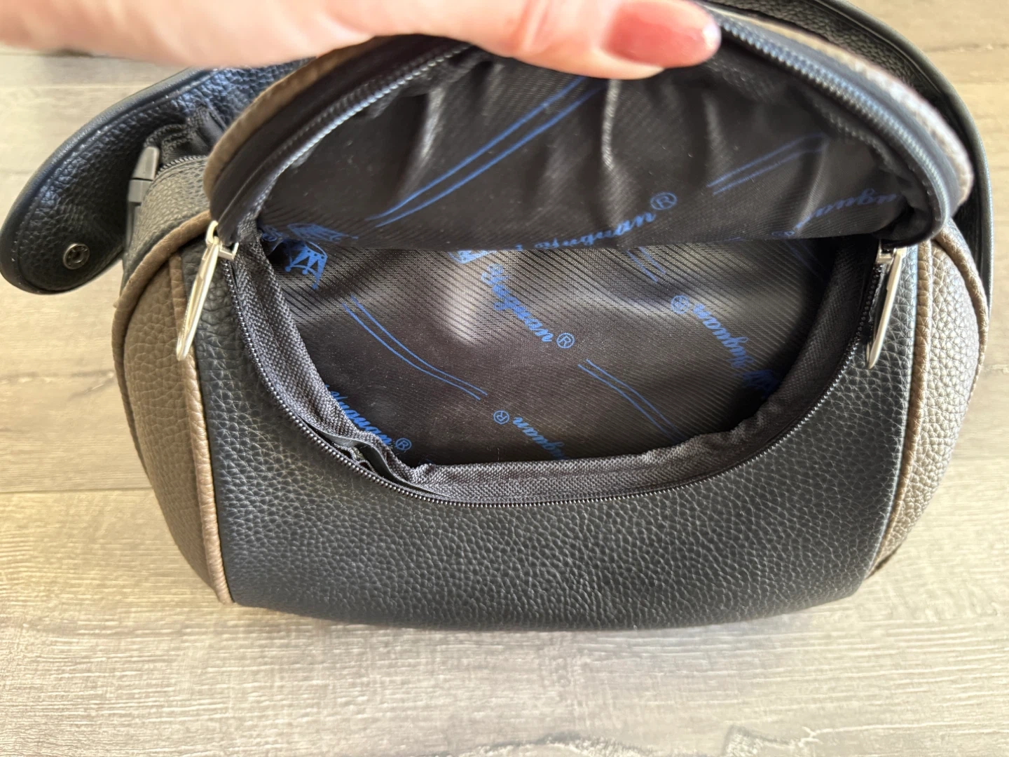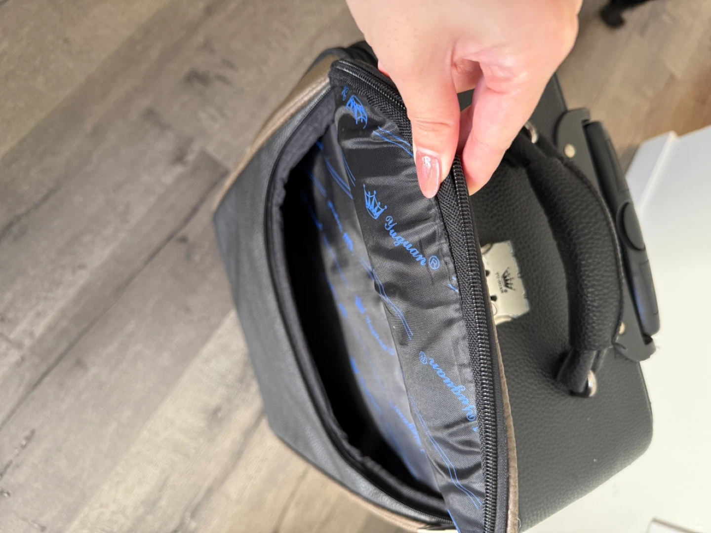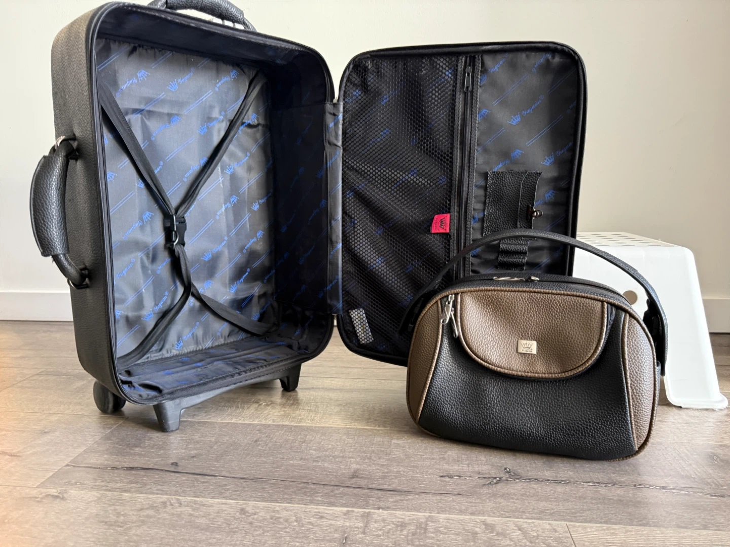 Selling a luxury real leather Verage rolling carry-on suitcase with a matching cosmetic bag. The set is in used condition, showing some wear on the suitcase. Perfect for travel!