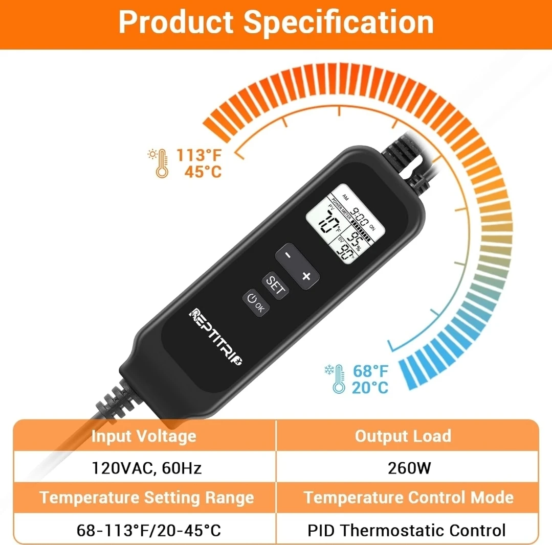 Looking to regulate the temperature for your reptile's habitat? This REPTITRIP dimming thermostat automatically adjusts heat lamps or pads to keep temperatures just right, day and night. It features PID thermostatic control and a temperature setting range of 68-113°F/20-45°C. It has a memory function and can be used for heat mats or heat lamps