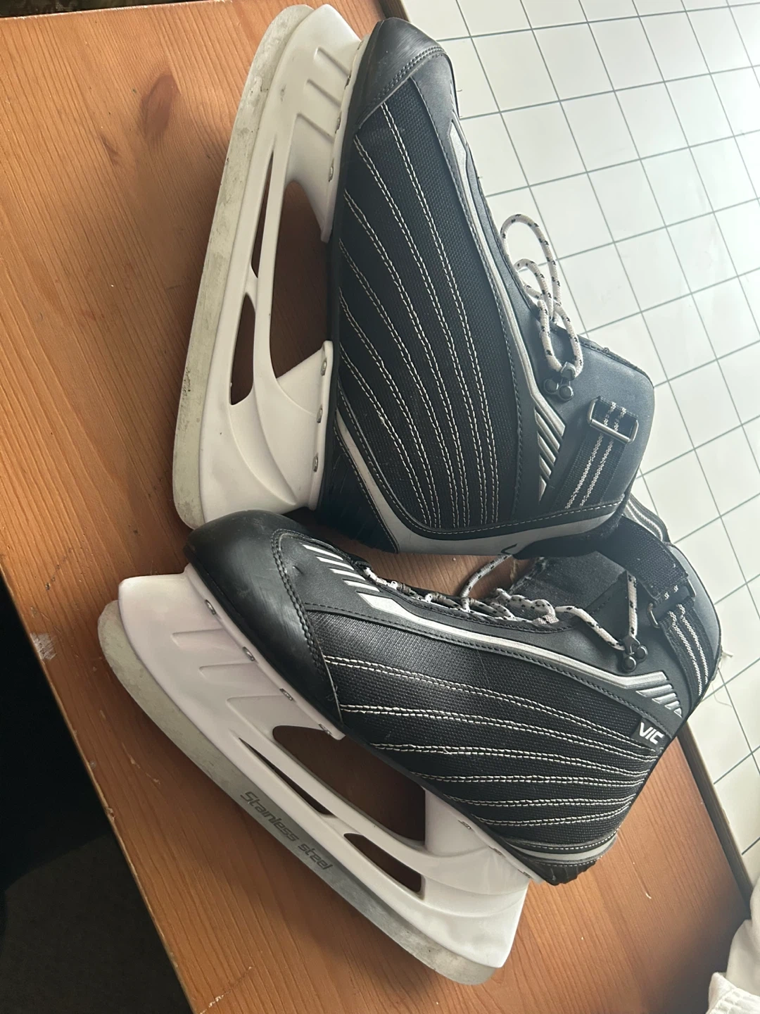 Here are a pair of VIC ice hockey skates. They are black and white and in good condition. The blades are stainless steel.