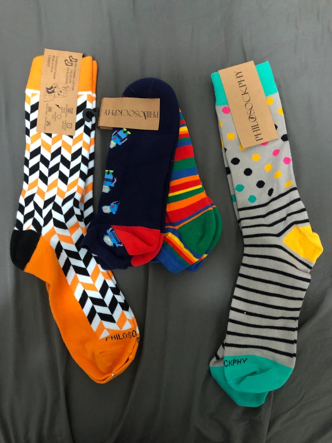 Check out these fun socks from Philosockphy! They're designed in Canada and made with a blend of cotton, nylon, and elastane for a comfy fit. The socks feature unique and colourful designs, perfect for adding a pop of personality to your outfit