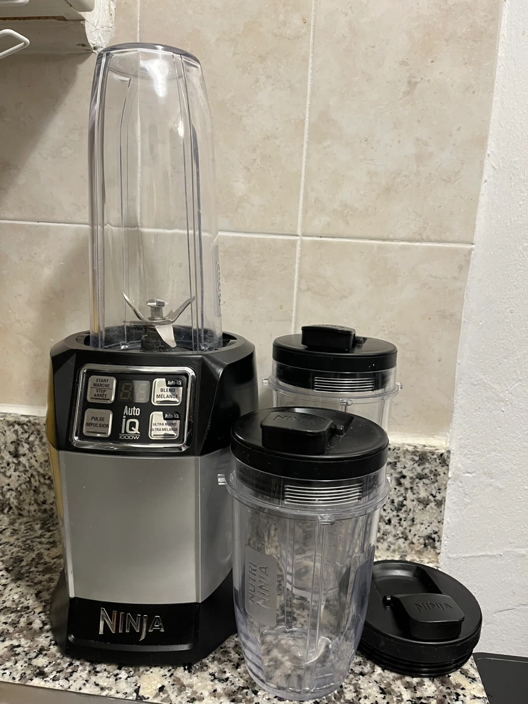 Selling a Nutri Ninja blender in great condition! It comes with multiple blending cups and lids. The blender features Auto-IQ technology for easy blending and is 1000W. Perfect for smoothies and shakes. It can crush ice cubes.