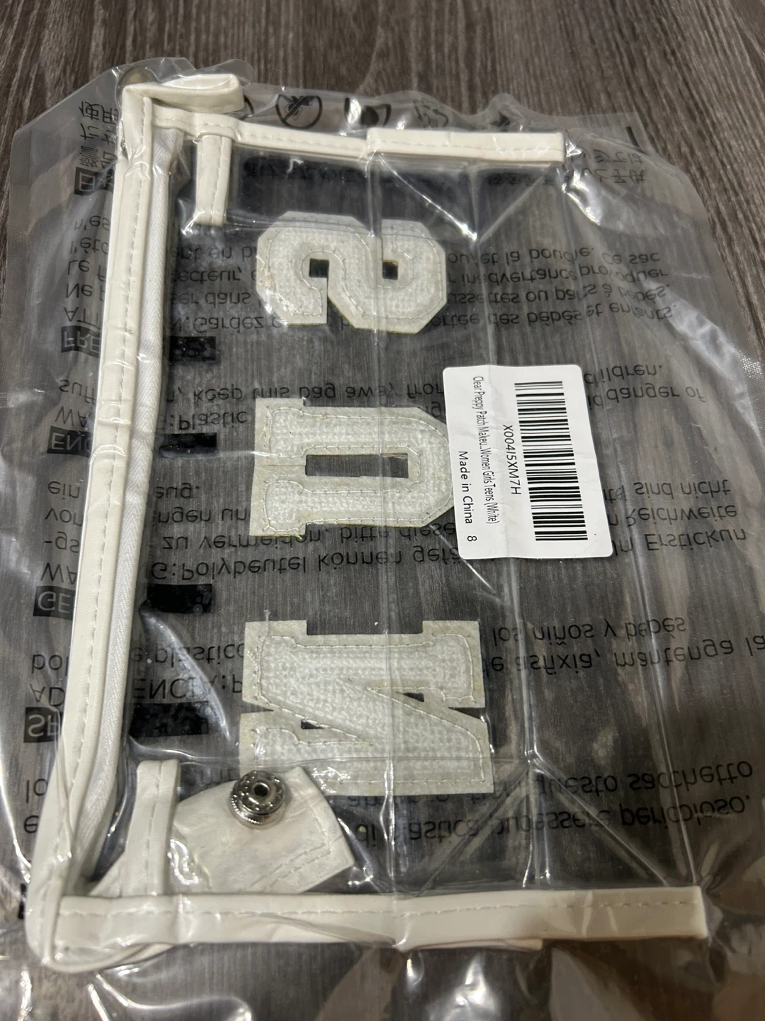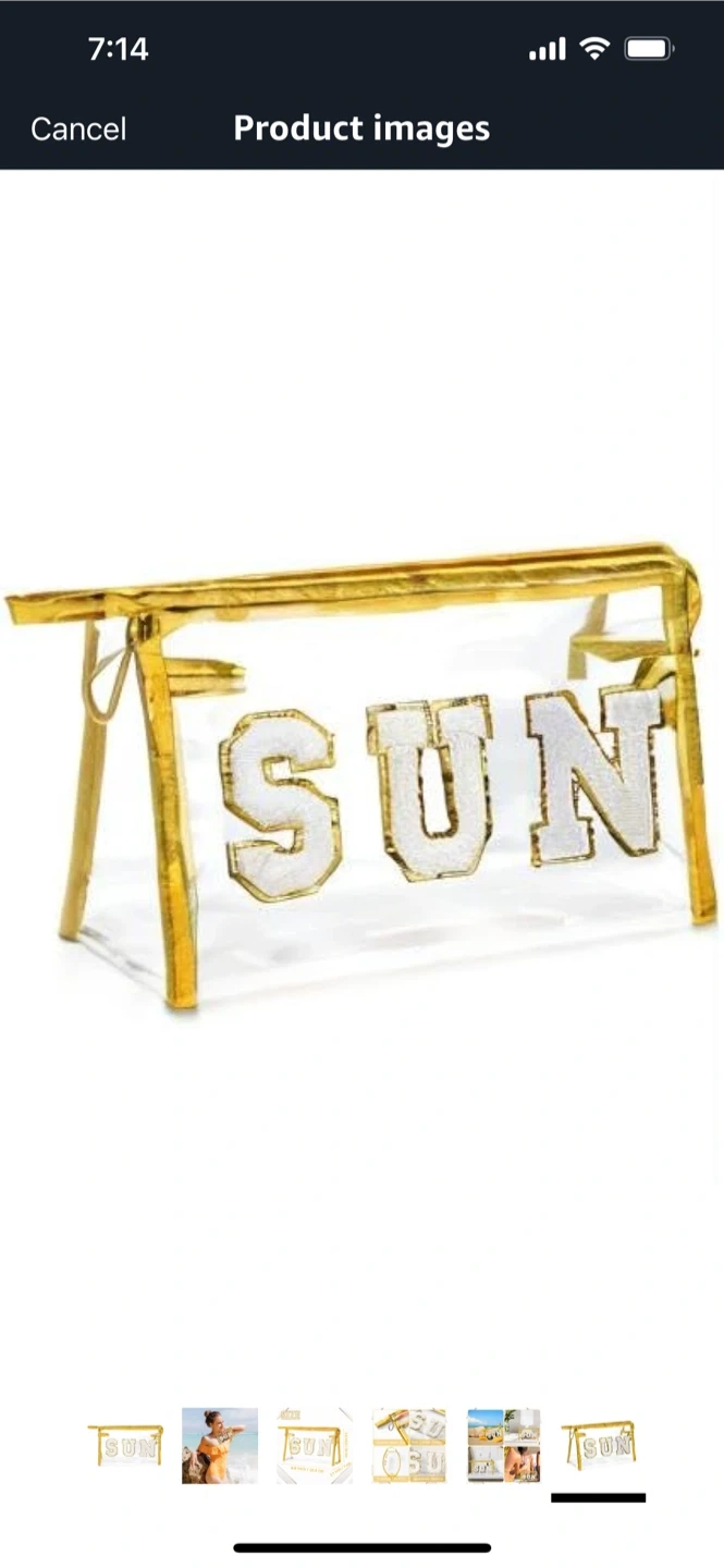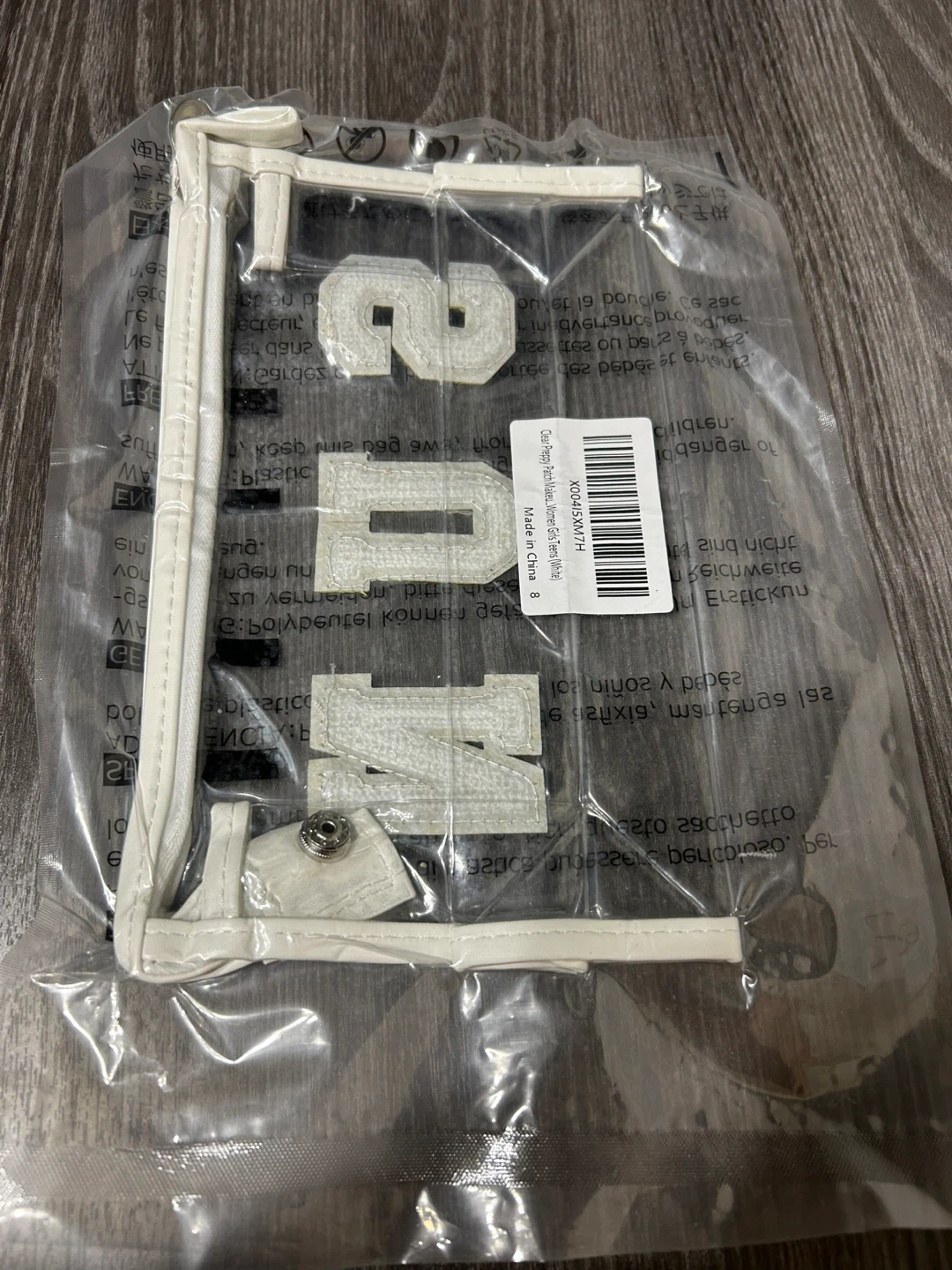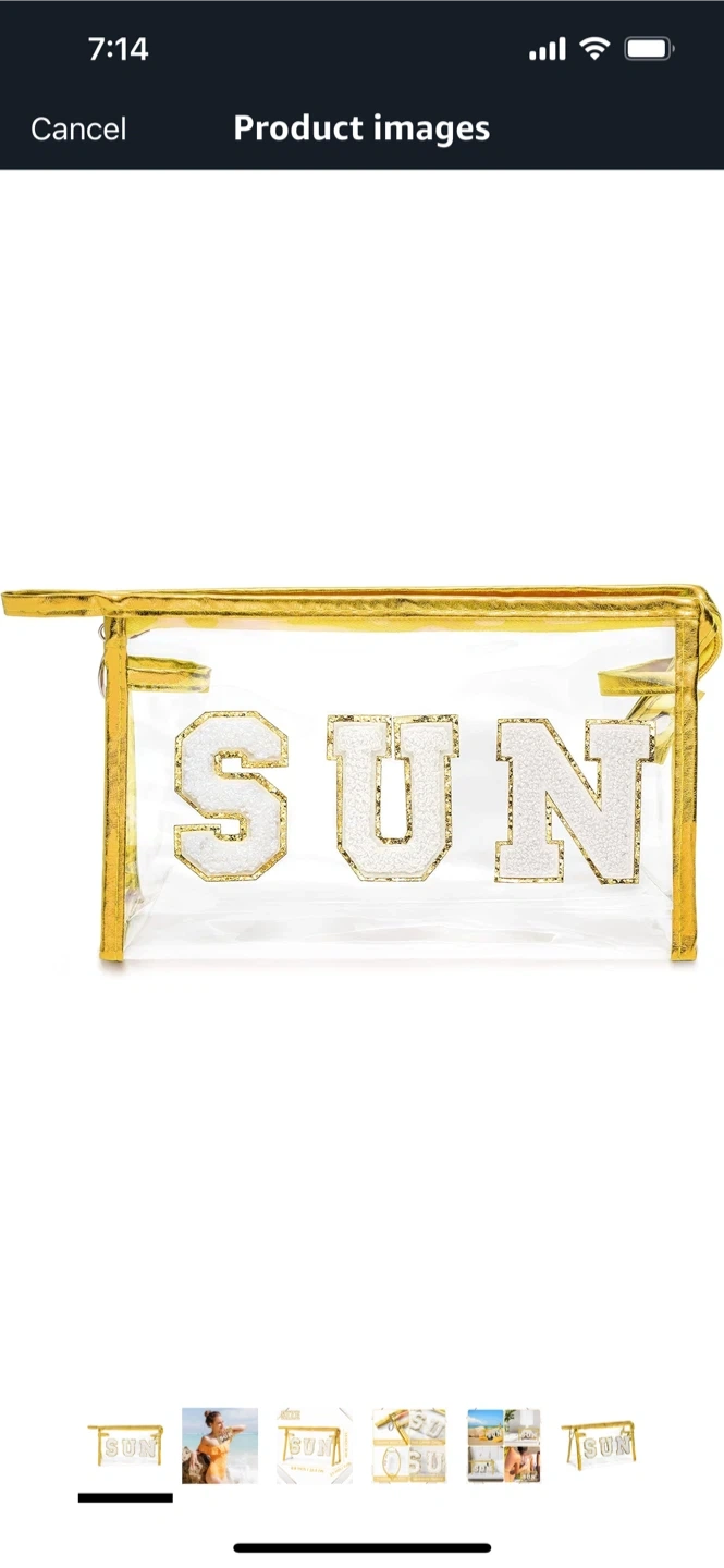 This is a brand new, clear cosmetic bag with the word "SUN" in felt letters. It features a quality alloy zip and waterproof material. The dimensions are 8.8 inches (22.5 cm) in length, 5.5 inches (14 cm) in height, and 2.7 inches (7 cm) in width!