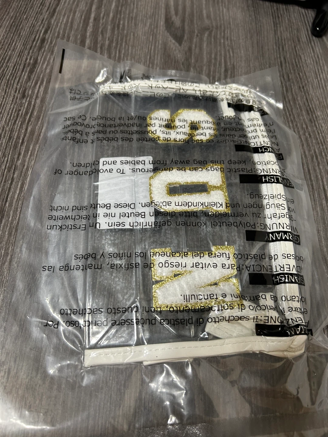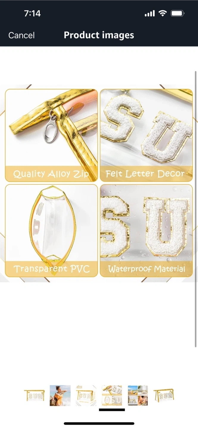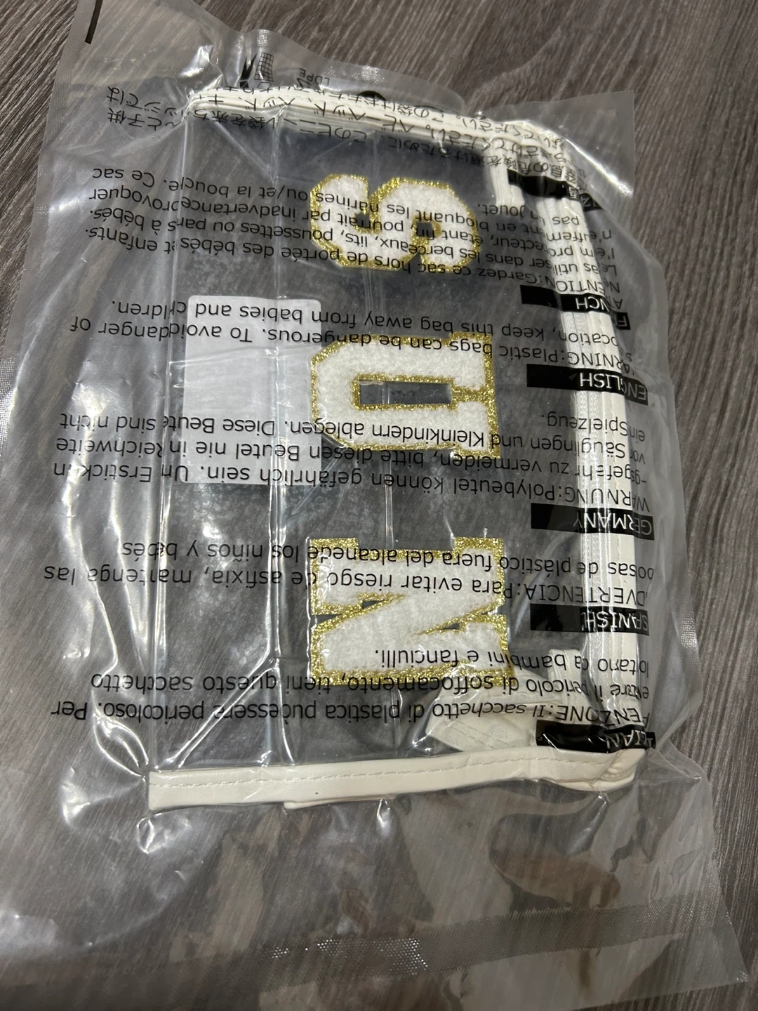 This is a brand new, clear cosmetic bag with the word "SUN" in felt letters. It features a quality alloy zip and waterproof material. The dimensions are 8.8 inches (22.5 cm) in length, 5.5 inches (14 cm) in height, and 2.7 inches (7 cm) in width!