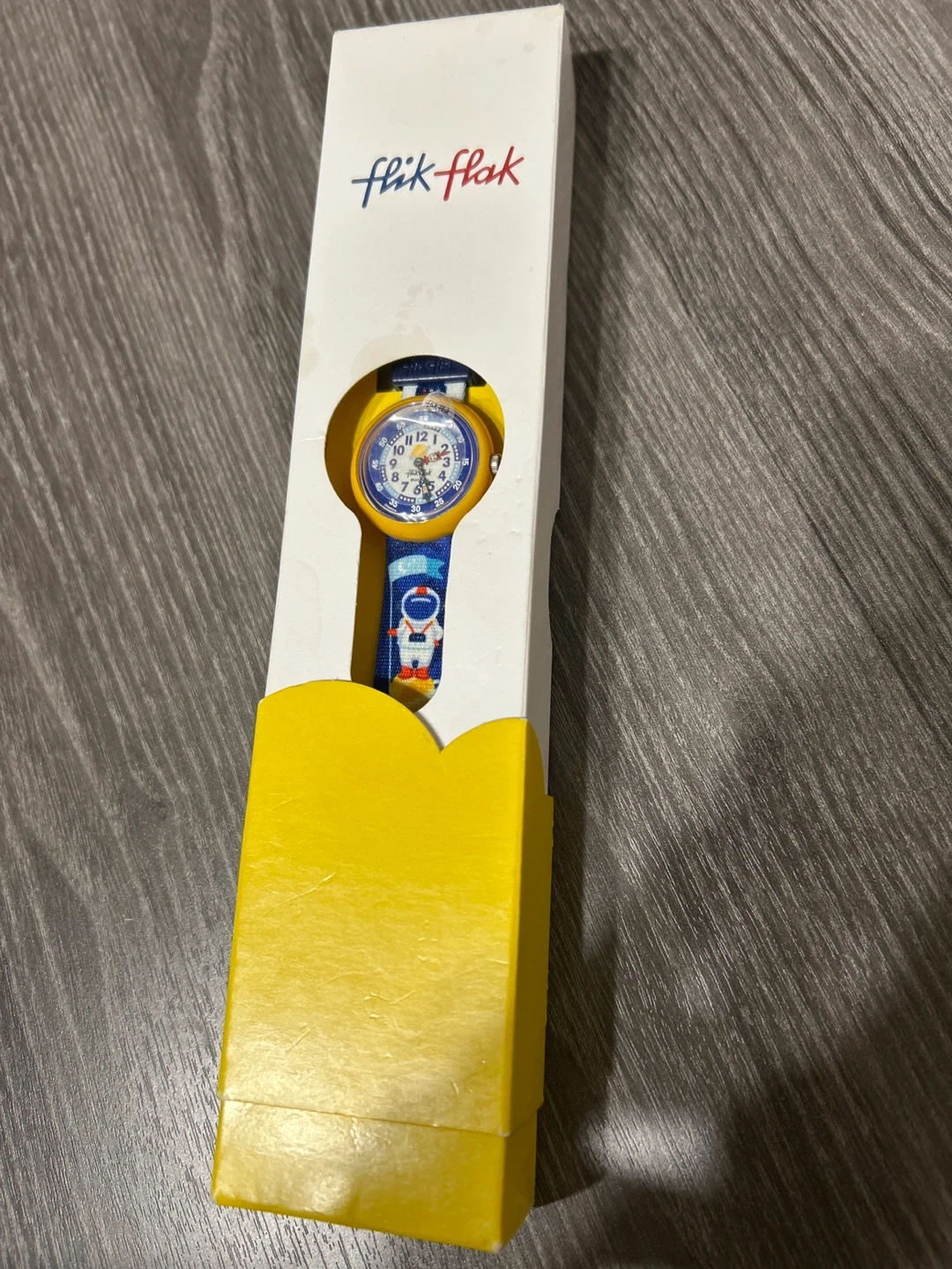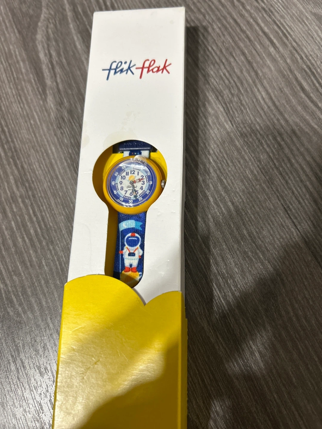 Selling a brand new Flik Flak kids watch with a fun space design! It comes with the original box and instructions. Perfect for helping your little one learn to tell time with a cool astronaut theme!