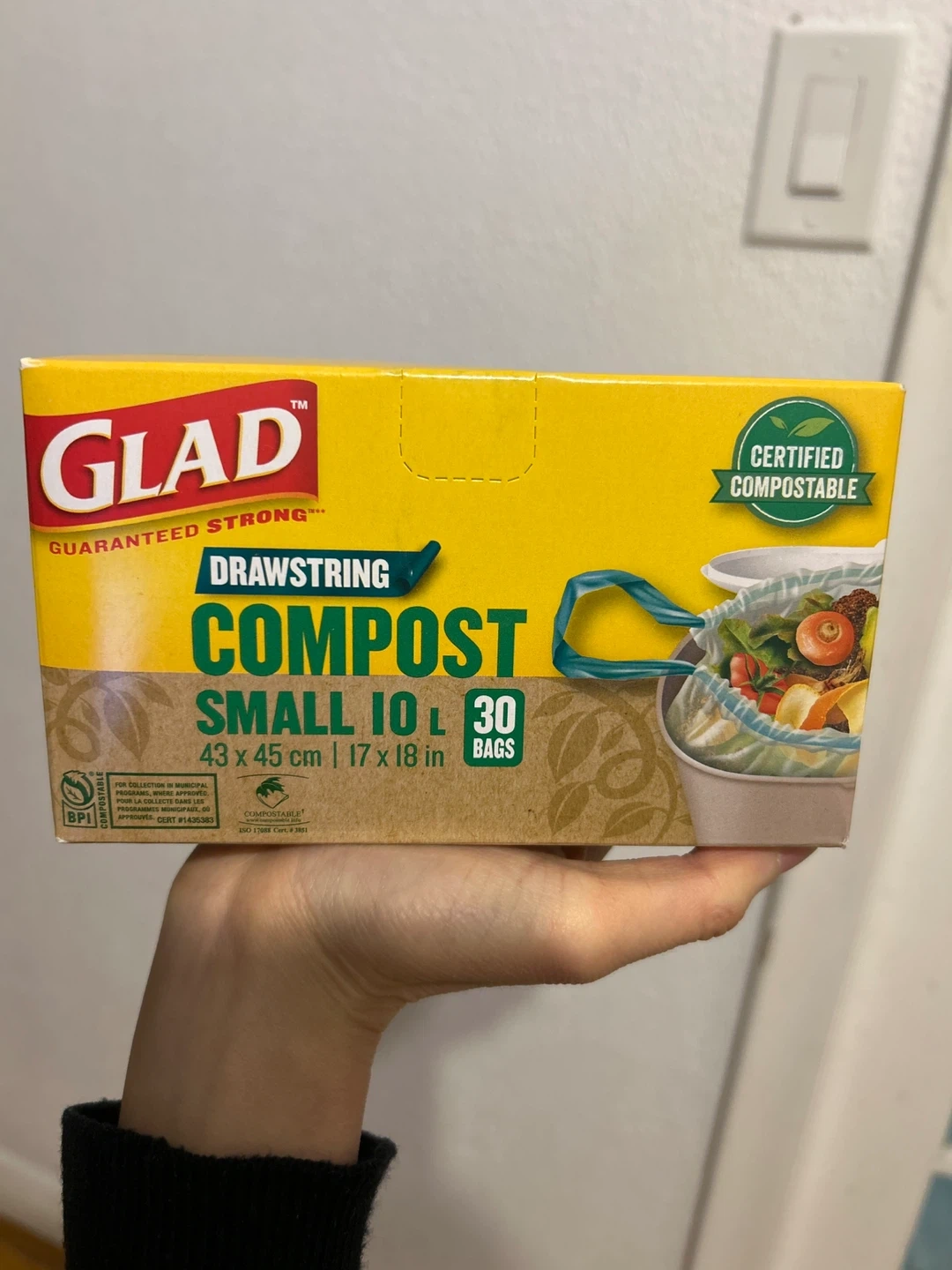 Selling a box of Glad compost bags. They are small, 10L bags, and there are 30 in the box. The bags are 43 x 45 cm or 17 x 18 inches. Great for collecting compost in municipal programs where approved