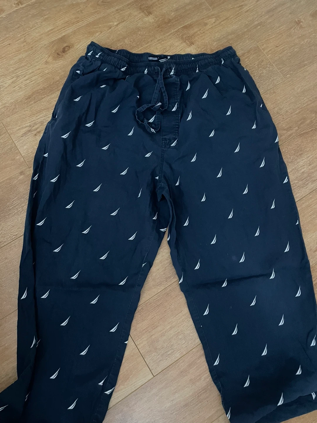 Comfy Nautica lounge pants in a dark blue colour with a white sailboat pattern