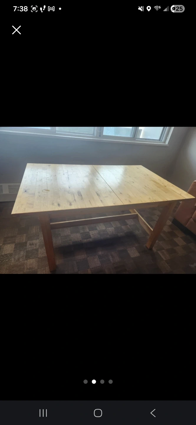 Selling a wooden dining table. It's extendable, making it perfect for both everyday meals and larger gatherings. There are some scratches on the surface, but it's still sturdy and functional