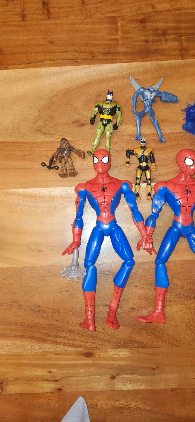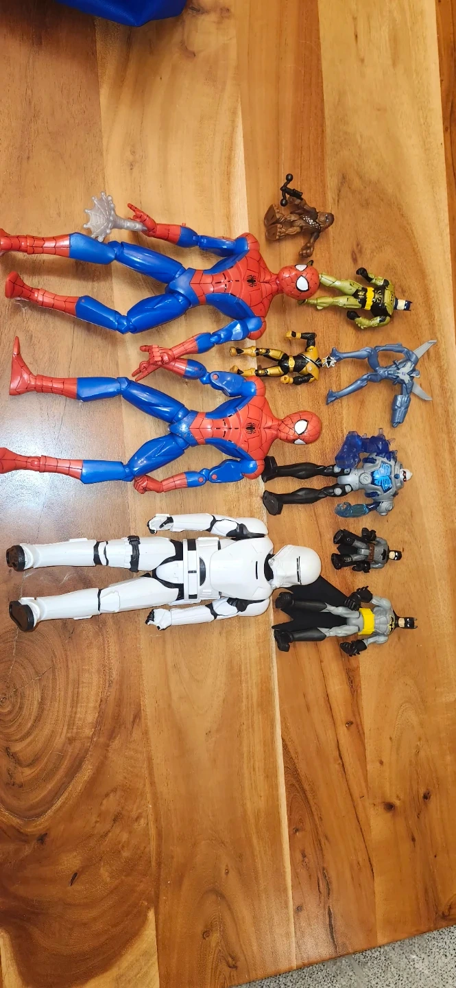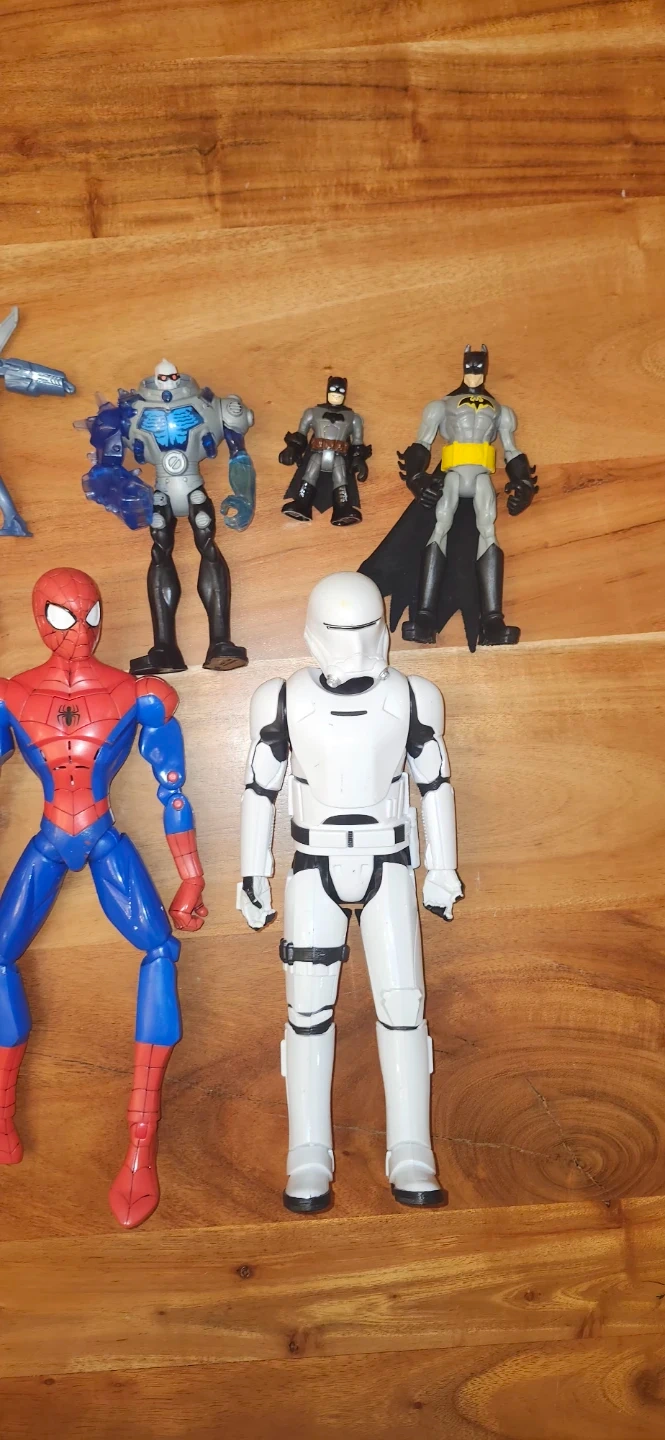 Selling a collection of action figures! Includes Batman, Spiderman, a Stormtrooper, and other cool characters. Great for kids or collectors!