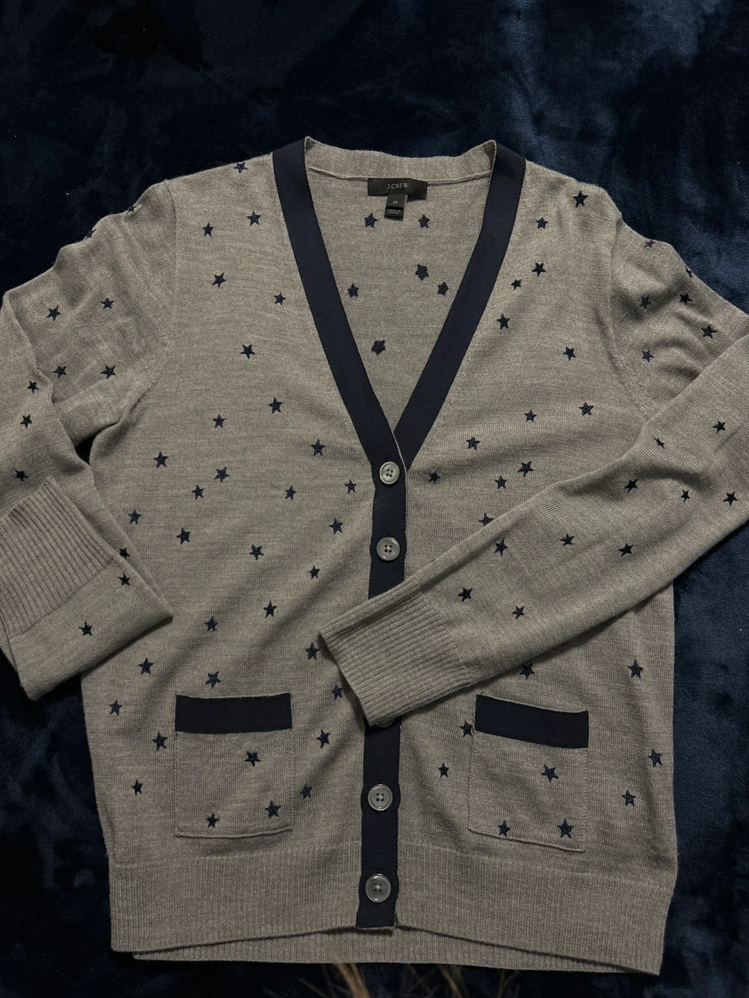 Cozy J.Crew cardigan in a soft grey colour with a cute star pattern! It features navy blue trim and is a size medium. Perfect for layering on cooler days!
