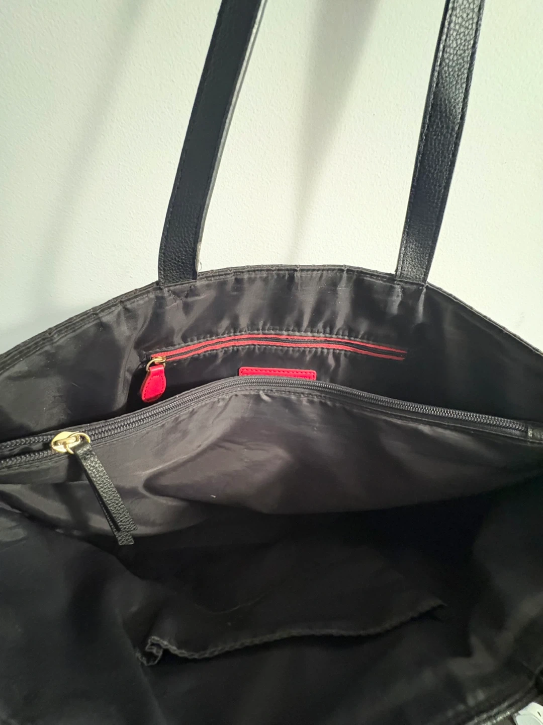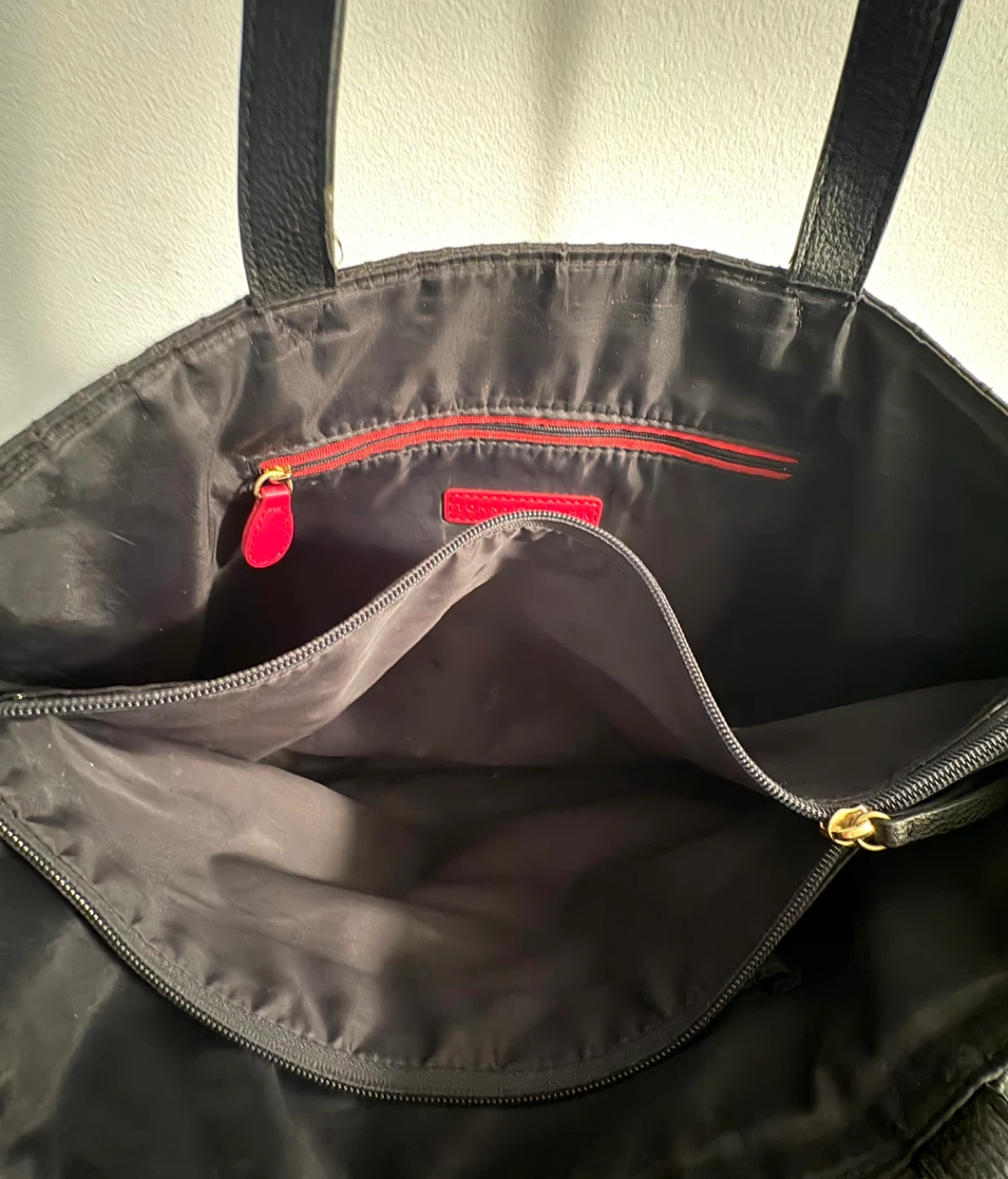 The interior has a red zipper pocket for added security and a stylish pop of colour