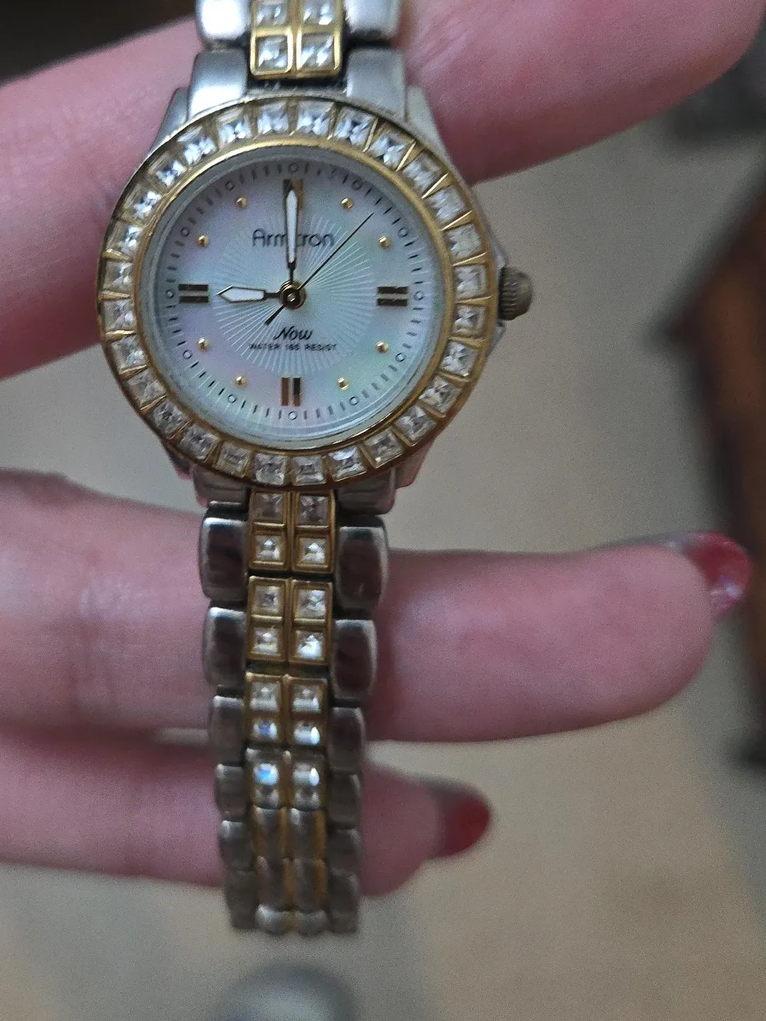 Selling an Armitron 'Now' women's watch. It has a silver and gold band with crystal accents around the face. A stylish timepiece!